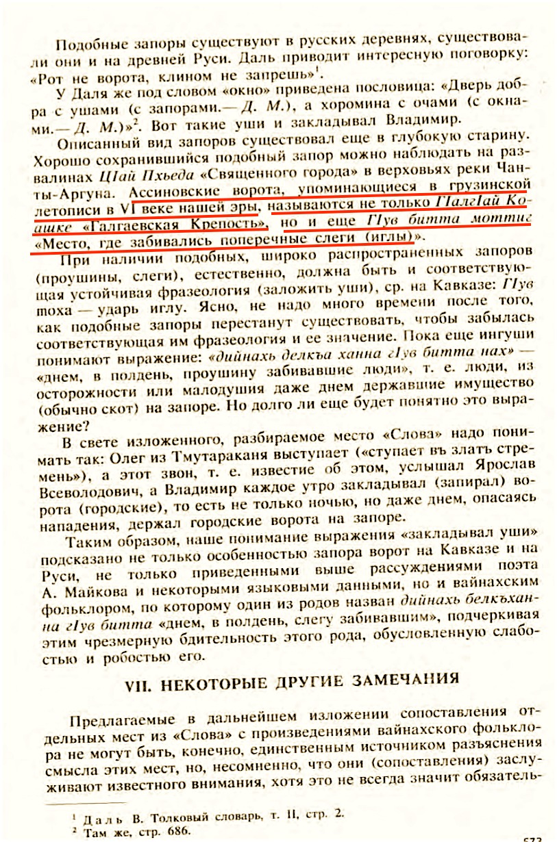 Ассиновские ворота, упоминающиеся в грузинской летописи в VI веке нашей эры, называются не только Г1алг1ай Коашке «Галгаевская Крепость», но и еще Г1ув битта моттиг