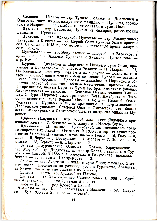 Цуровы — Джерахой из Верхнего и Нижнего аула Озми, проживают в Дарьяльском с/С., Новом Реданте — 11, Назрани — 24, Назрановские носят птр. имя Гета н., а другие — Соала-н., те и другие кровной связи между собой не имеют, Цуровы — осетины в селе Зилга, Чораевы — Цороевы — выходцы из Цоринского общества горной Ингушетии, вблизи Чура-чочхи, притока Ассы.  У Чура (Цуровы) было три сына: Бога, Джейрахе, и Джабо — основатель аула Верхний Озми, а Бога — Нижний Озми.