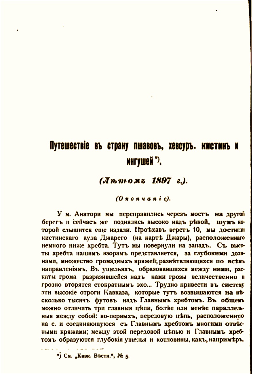 … Скоро мы достигли аула Гули, где тамошние люди нас встретили с большими почестями. Среди них выделялся молодой ингуш с живым умом. Он хорошо говорил по-русски, был грамотен и стремился усовершенствовать свои знания. Он упрашивал нас, чтобы мы непременно прислали ему книг для чтения, что нами и было исполнено по приезде во Владикавказ.