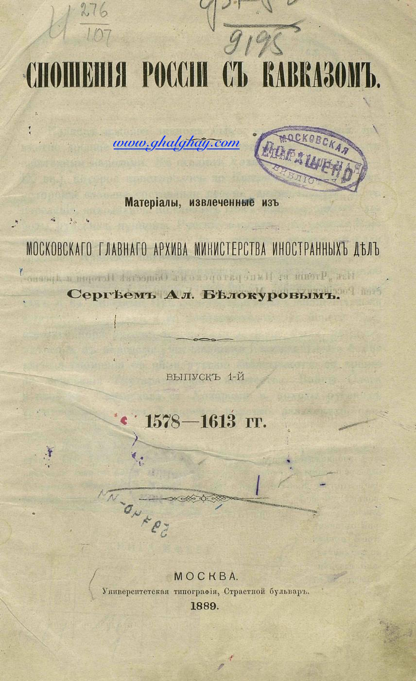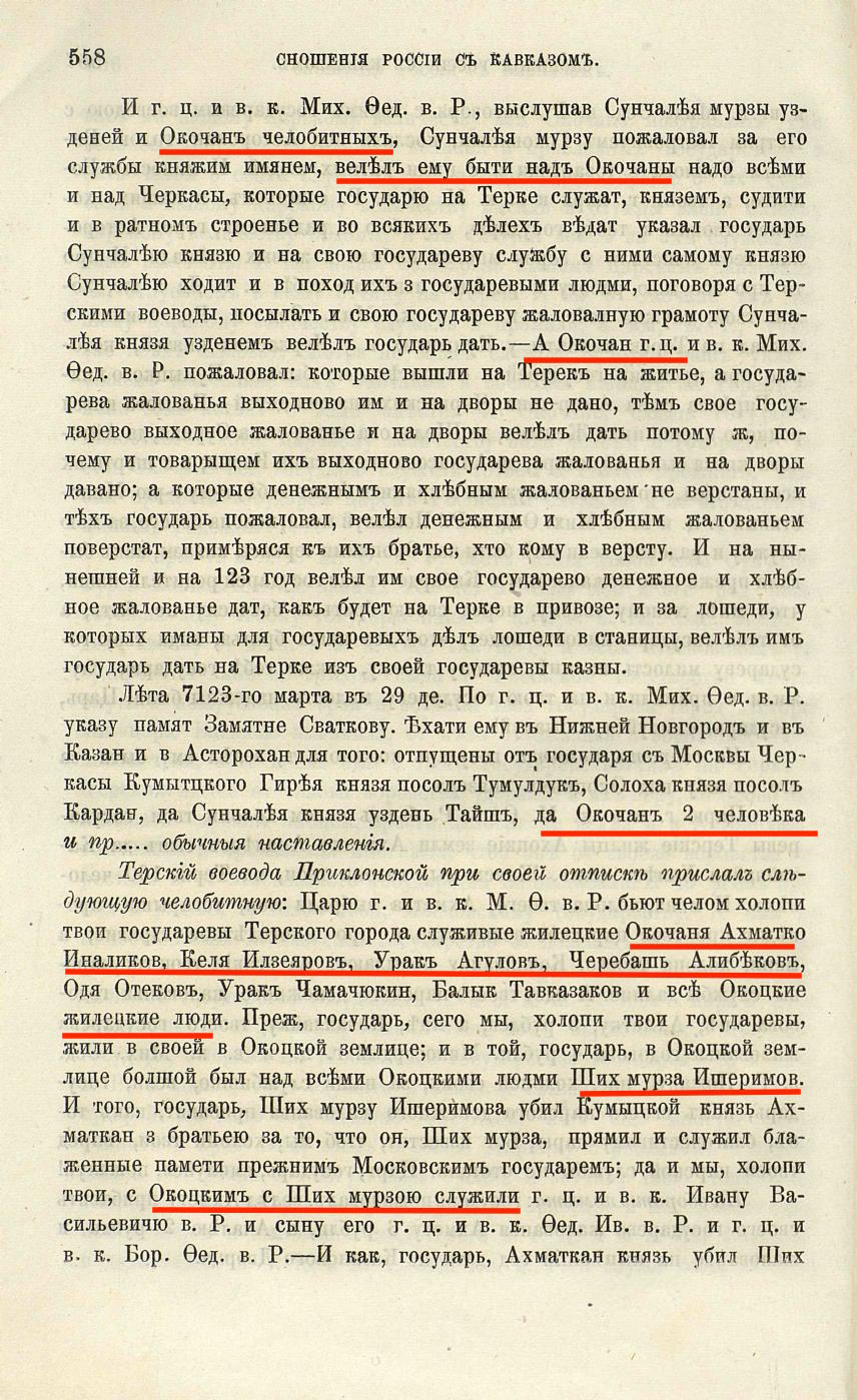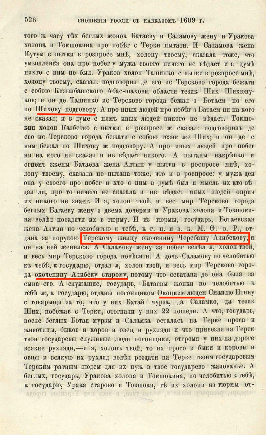 Окочанин Черебаш Алибеков(Чербижев) в 1589 году // Сношения России с Кавказом 1578-1613 гг., Москва, 1889.
