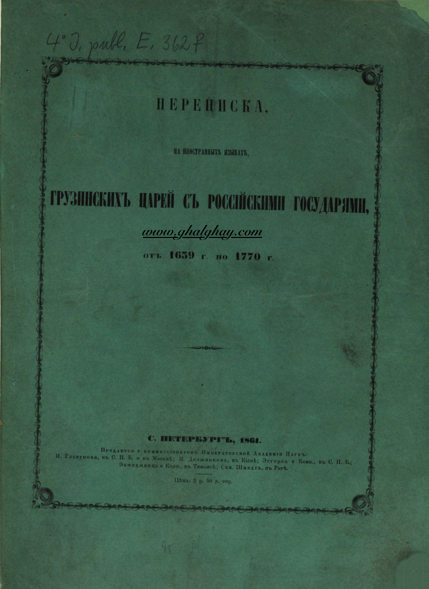 Переписка, на иностранных языках грузинских царей с российскими государями от 1639 г. по 1770 г. / [«Предуведомление»: Броссе]. — Санкт-Петербург : тип. Имп. Акад. наук, 1861. — [14], XCII, 233 с.; 31.
