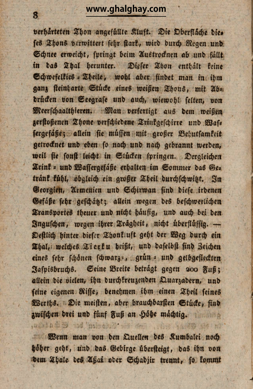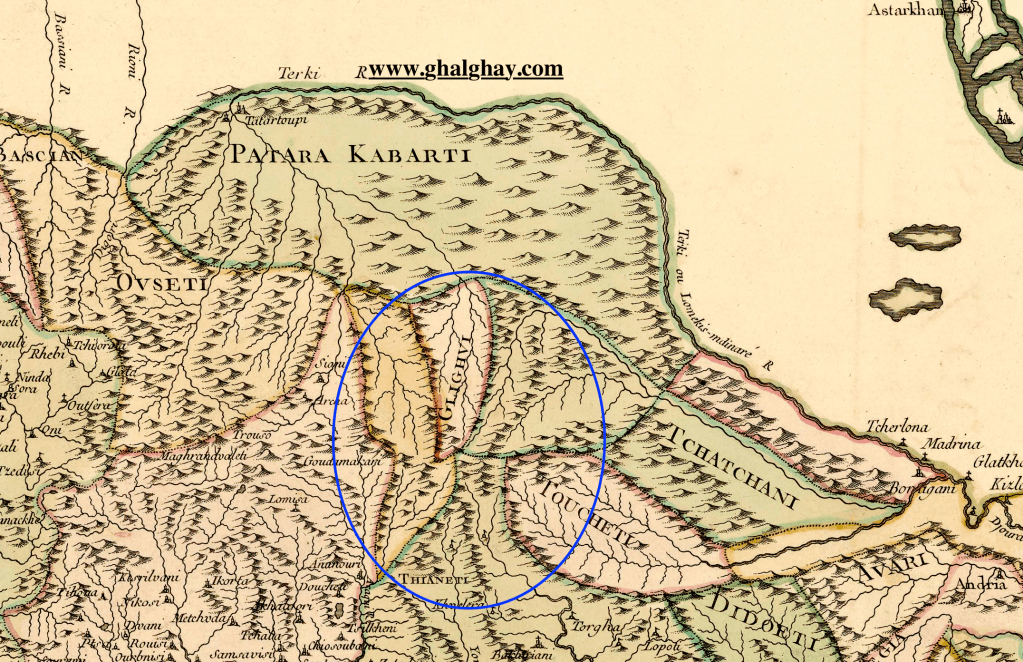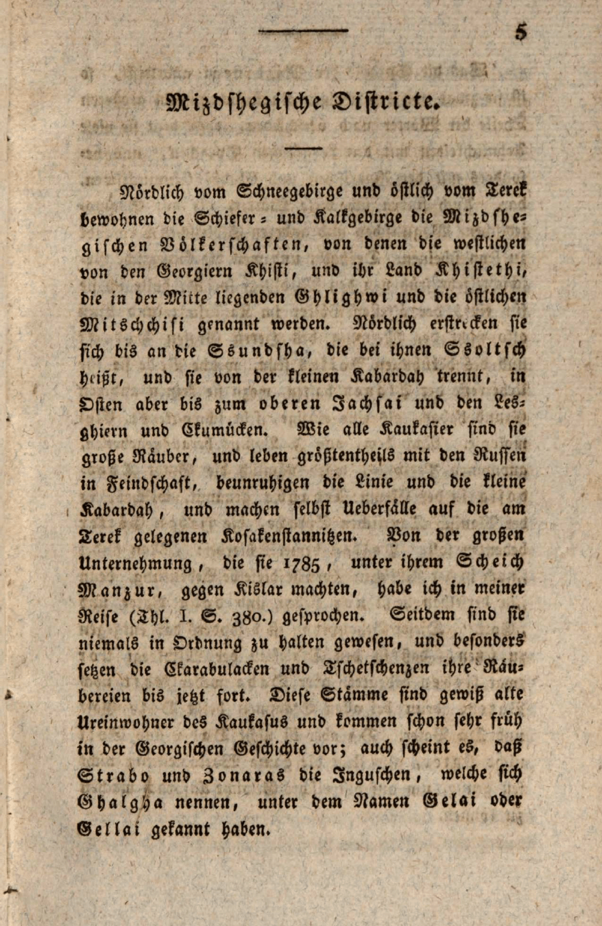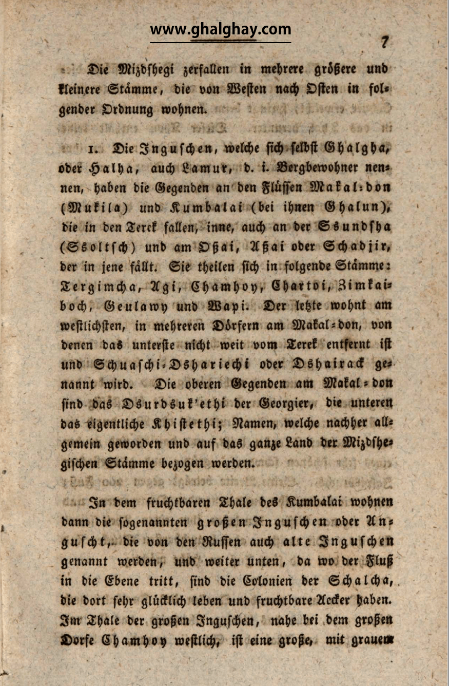 Wenn man von den Quellen des Kumbalei noch höher geht, und das Gebirge überſteigt, das ihn von dem Thale des Aßai oder Schadjir trennt, ſo kommt man in die Gegend Ghalgha (Georgisch GHLIGHWA), die der Stammort der Inguſchen iſt, und von den Quellen der Ssundſha gerade eine Teutſche Meile in Süden liegt. Noch höher im Schneegebirge iſt der Diſtrict Meeſti, der mit den Phſchawi- und Thuſchi in Georgien gränzt, und an einem Nebenbache liegt, Naſchachi. Unter Ghalgha wohnen die Schalcha oder kleinen Inguſchen, in einem großen Thale, auf der Linken des Aßai.