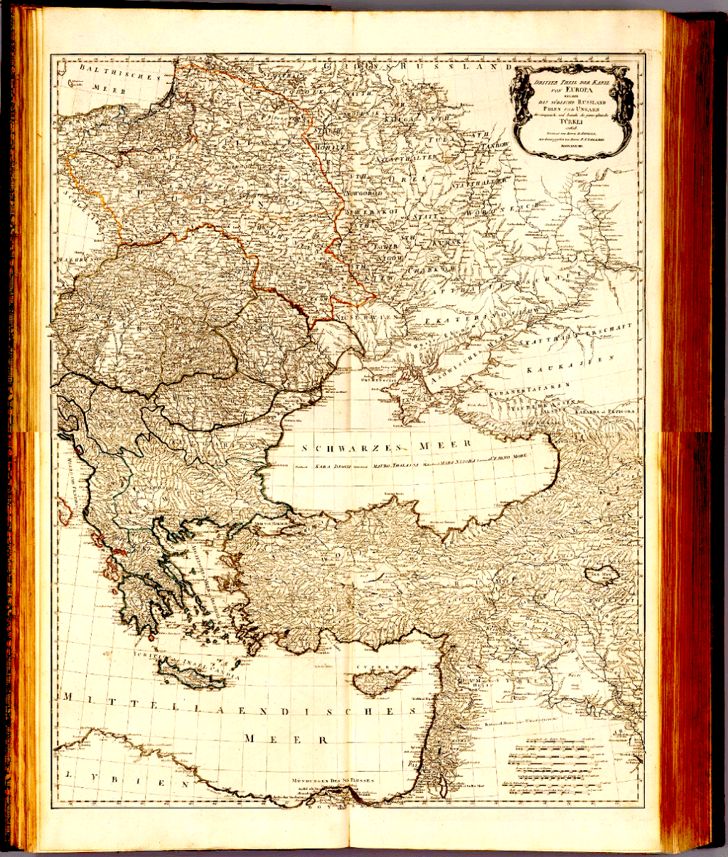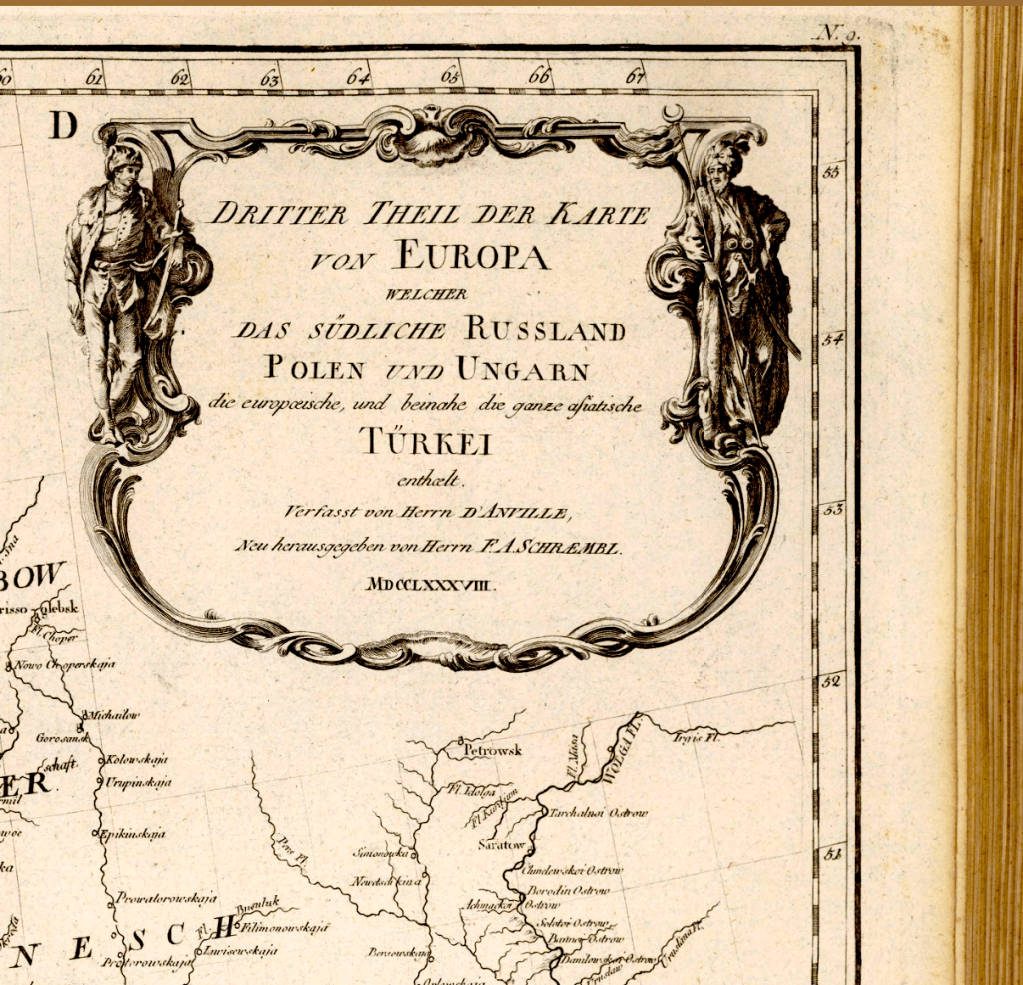Примечание: (Composite Map) 9-10. Dritter Theil der Karte von Europa welcher das Suedliche Russland, Polen un Ungarn die europoaeische, und beinahe die ganze asitische Tuerkei enthaelt. Verfasst von Herrn D’Anville, New herausgegeben von Herrn F.A. Schraembl. MDCCLXXXVIII.