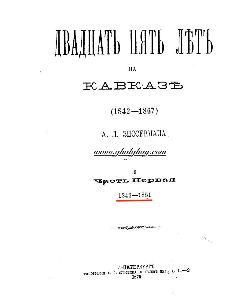 Двадцать пять лет на Кавказе (1842-1867) А. Л. Зиссермана. Ч. 1. 1842-1851. — Санкт-Петербург : Суворин, 1879