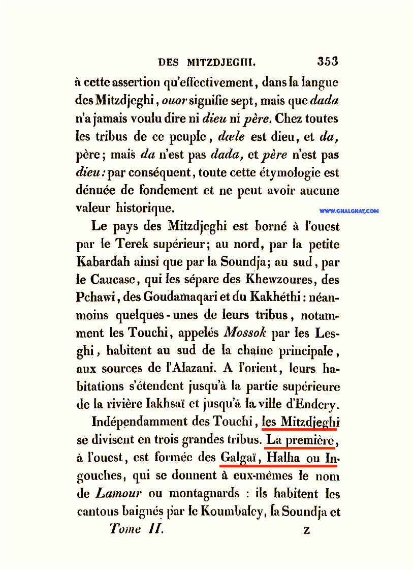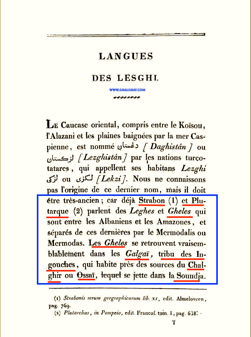 Nous ne connaissons pas l’origine dé ce dernier nom, mais il doit être très-ancien ; car déjà STRABON (1) et PLUTARQUE (2) parlent des Leghes et GHELES qui sont entré ies Albaniens et les Amazones , et séparés de ces dernières par le Mermôdaïis ou Mermodas. Les GHELES se retrouvent vraisem blablement dans les GALGAI , tribu des INGOUCHES, qui habite près des sources du CHALGHIR ou OSSAI, lequel se jette dans la SOUNDJA. — ГЕЛЫ СТРАБОНА И ПЛУТАРХА ЭТО ИНГУШСКОЕ ПЛЕМЯ ГАЛГАЙ.