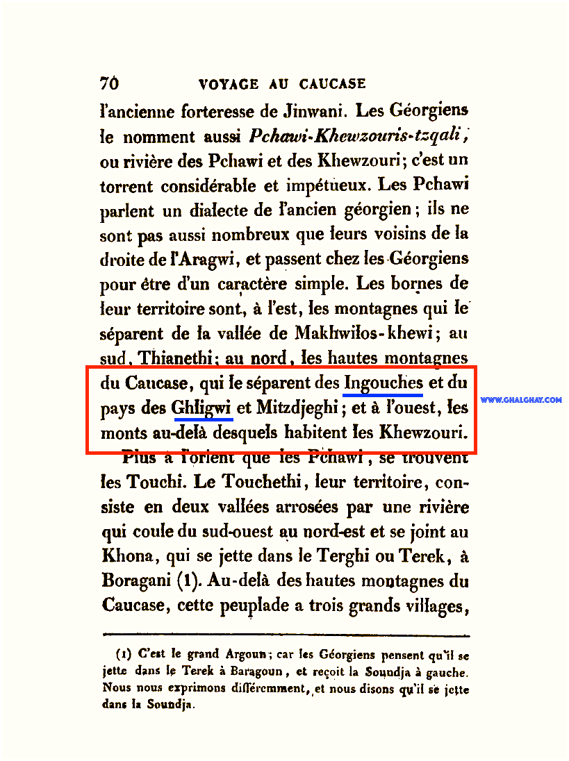 A l’ouest de la Vallée du Moukii, il faut franchir une montagne escarpée , pour arriver dans la vallée du Koumbaley, où habite la tribu ingouche de GHALGAI [GHLIGHWI en géorgien ] ; elle dérive son nom d’un petitfils de DSOURDSOUKOS -К западу от горной долины Моуки (мохевцы), вы должны пересечь крутую гору, чтобы добраться до долины Кумбалей, где проживает ИНГУШСКОЕ племя ГIАЛГIАЙ (GHLIGHWI (ГЛИГВИ) на грузинском языке); оно получило свое название от имени внука DSOURDSOUKOS (ДЗУРДЗУКОСА)