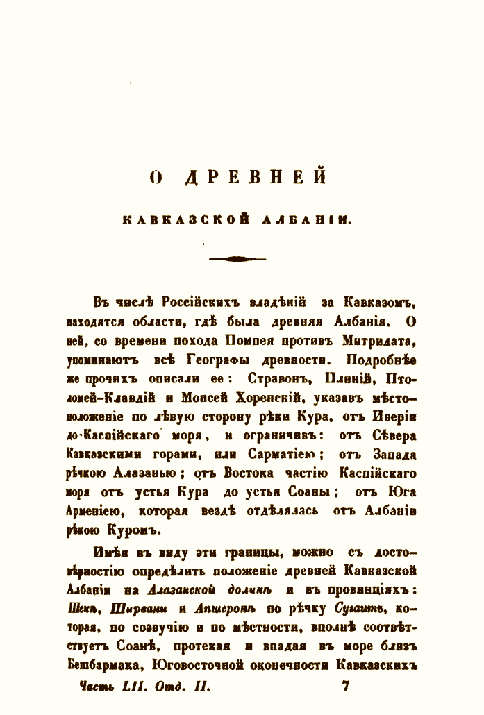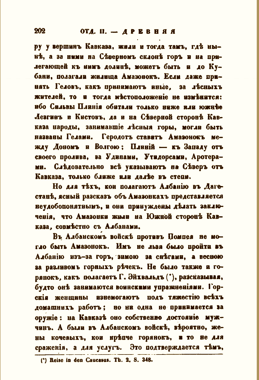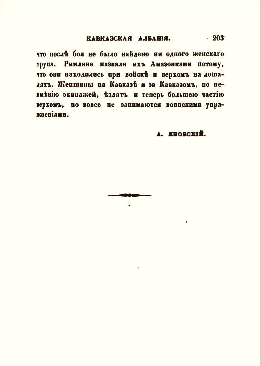 В Албанском войске против Помпея не могло быть Амазонок. Им нельзя было пройти в Албанию из-за гор, зимою за снегами, а весною за разливом горных речек. Не было также и горянок, как полагает Г. Эйхвальд (Reise in den Caucasus. Th.2 S.348), рассказывая, будто они занимаются воинскими упражнениями. Горские женщины изнемогают под тяжестью всех домашних работ; но ни одна не принимается за оружие: на Кавказе оно собственно достояние мужчин. А были в Албанском войске, вероятно, жены кочевых, кои крепче горянок, и то не для сражения, а для услуг. Это подтверждается тем, [с.203] что после боя не было найдено ни одного женского трупа. Римляне назвали их Амазонками потому, что они находились при войске и верхом на лошадях. Женщины на Кавказе и за Кавказом, по неимению экипажей, ездят и теперь большею частью верхом, но вовсе не занимаются воинскими упражнениями.