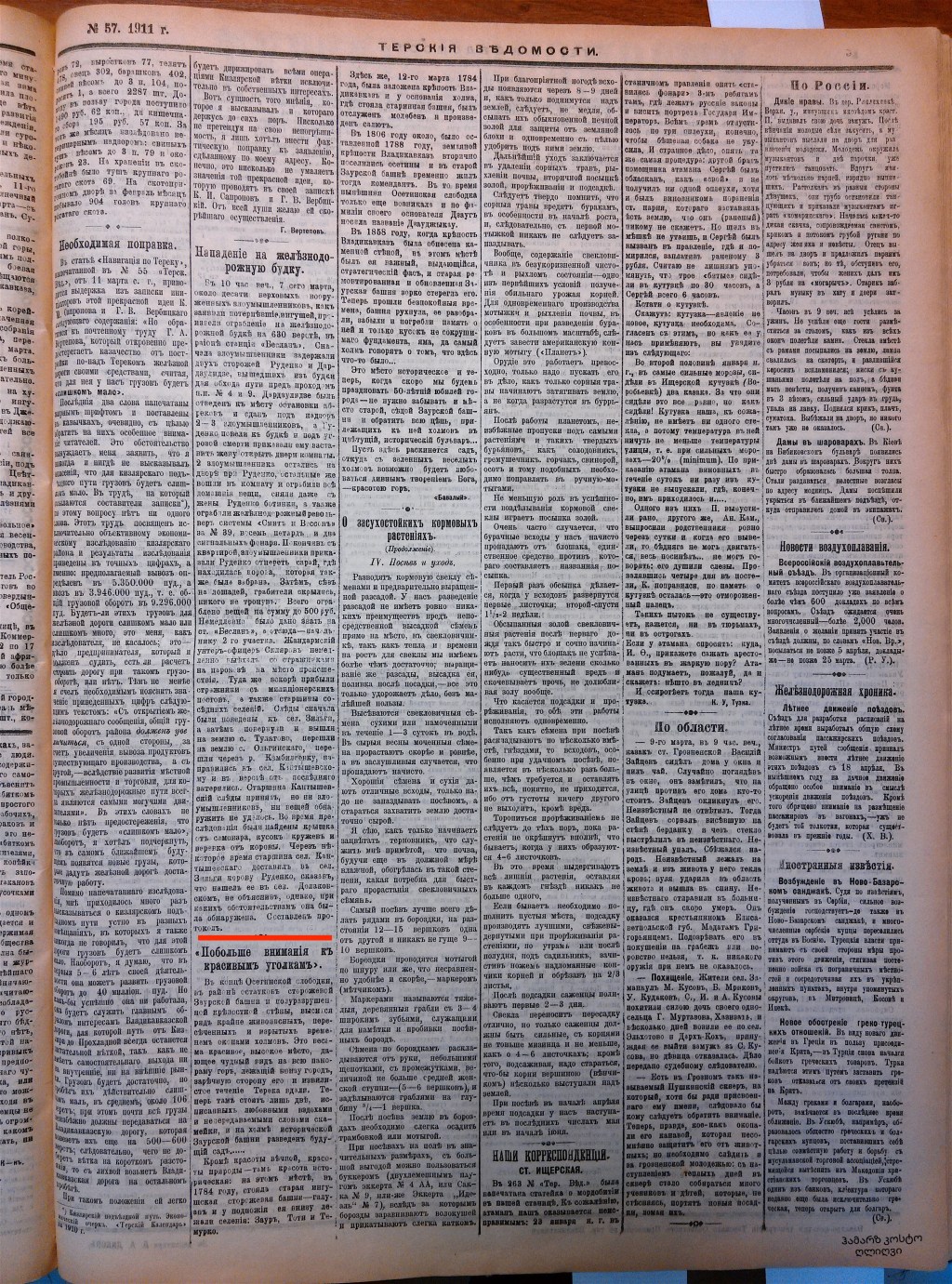 «Бывалый » Газета «Терские ведомости», 1911 г., № 57.