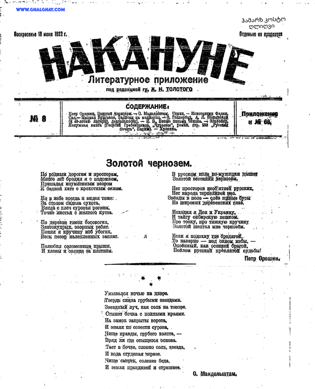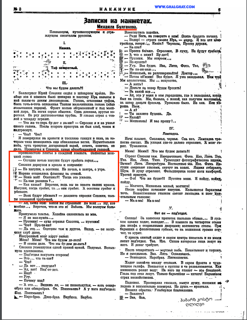 «Прошелестело платье в соседней комнате. Зашептал женский голос: — Сегодня ночью ингуши будут грабить город… Слезкин дёрнулся в кресле и подправил: — Не ингуши, а осетины. Не ночью, а завтра, с утра. Нервно отозвались флаконы за стеной: — Боже мой ! Осетины ?! Тогда это ужасно. — Ка-кая разница …? — Как какая ? Впрочем вы не знаете наших нравов. Ингуши, когда грабят, то… грабят. А осетины грабят и убивают. — Всех будут убивать? — деловито спросил Слезкин, пыхтя зловонной трубкой.» М.Булгаков «Записки на манжетах», газета «Накануне», Берлин, 1922 год