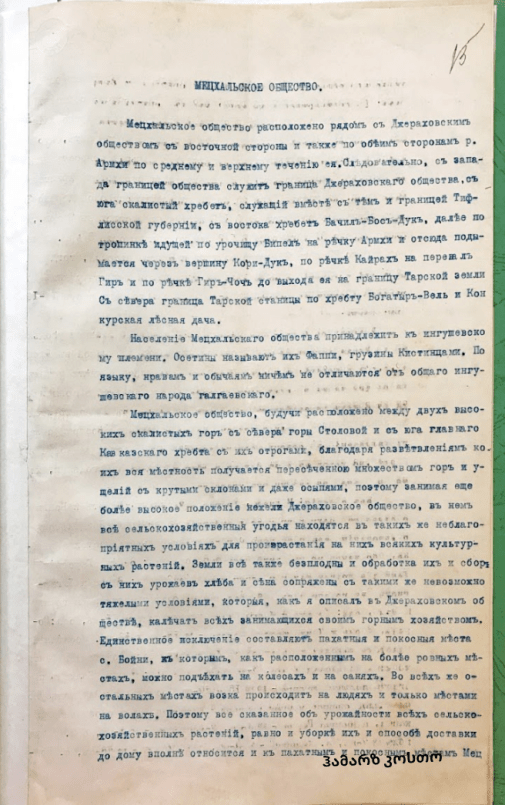 Площади обоих самых важных в хозяйстве горцев угодий пахотных и сенокосных земель так ничтожны, что не могут обеспечить общество кормовыми средствами даже на самое короткое время. Так если принять цифру пахотной земли найденную по карте за более достоверную, хотя по осмотру на месте, многие из пахотных земель, обозначенных на карте пахотными, заброшены, то и тогда урожай всех пахотных земель даст не более 5 пудов. А так как эти земли дают при существующей у них системы обработки только два урожая в три года, то в среднем в год на душу населения получим 3 1/3 пуда или 133 1/3 фунта, т.е. пропорцию для прокормления одного человека в течении 66 1⁄2 дня, считая по 2 фунта в день и не более как в течении 22 дней по данным полученным от опроса жителей. А урожай сена с 1329 д[есятин] 2370 косых сажень не может прокормить весь наличный состав скота Мецхальского общества даже в течении одного зимнего дня. Площади пастбищ и лесов служат только для удовлетворения своих нужд за пастбищное летнее время. За время же с 1 сентября и по 15 мая они должны пасти скот на арендуемых землях на плоскости.