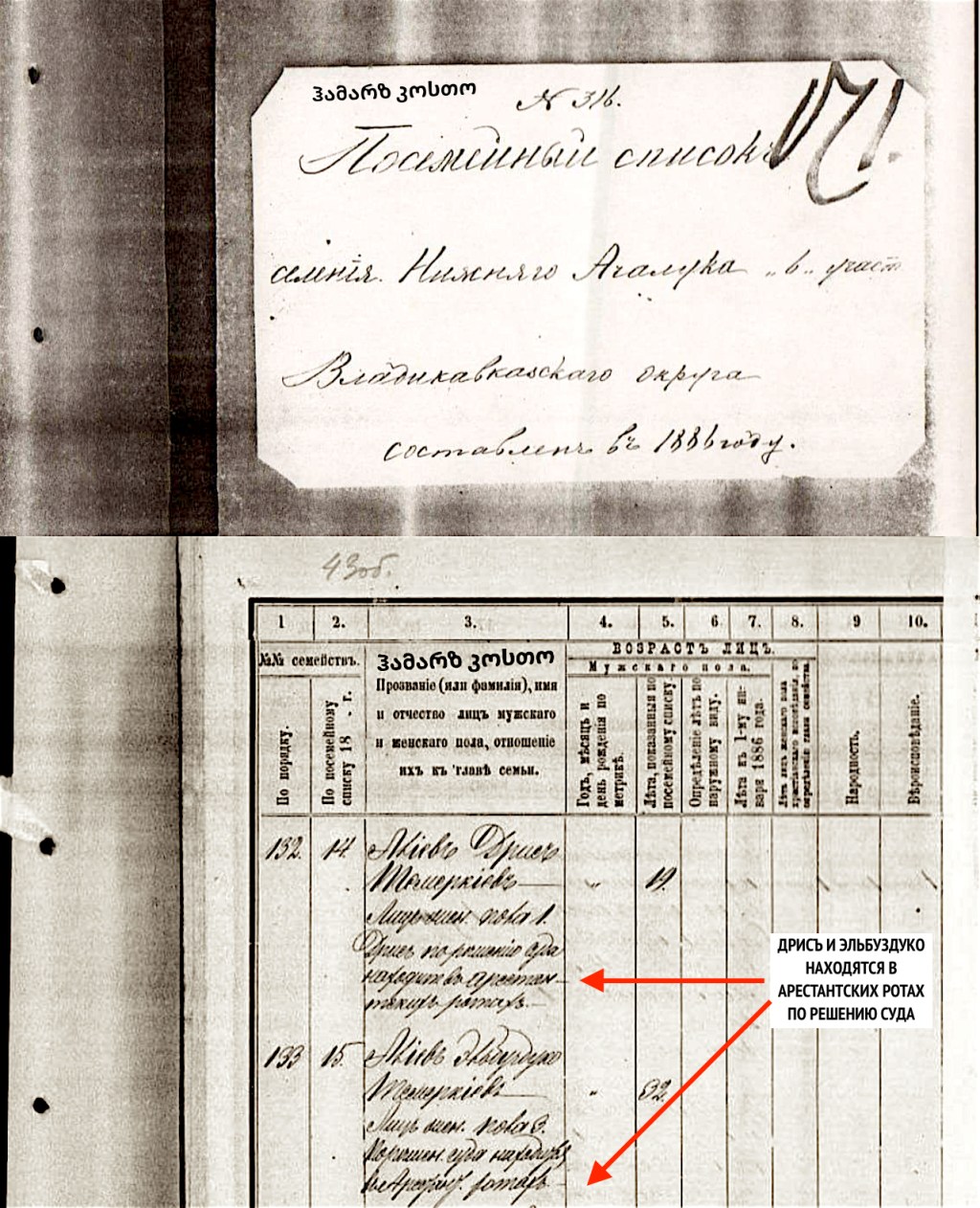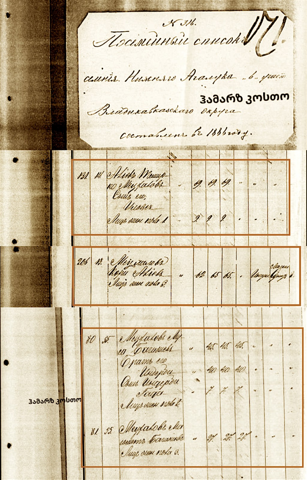 Сыновья Али Мецхалова(Костоева) Темиркъо и Кори (Кхери) в посемейных списках селения Н. Ачалуки за 1886 год