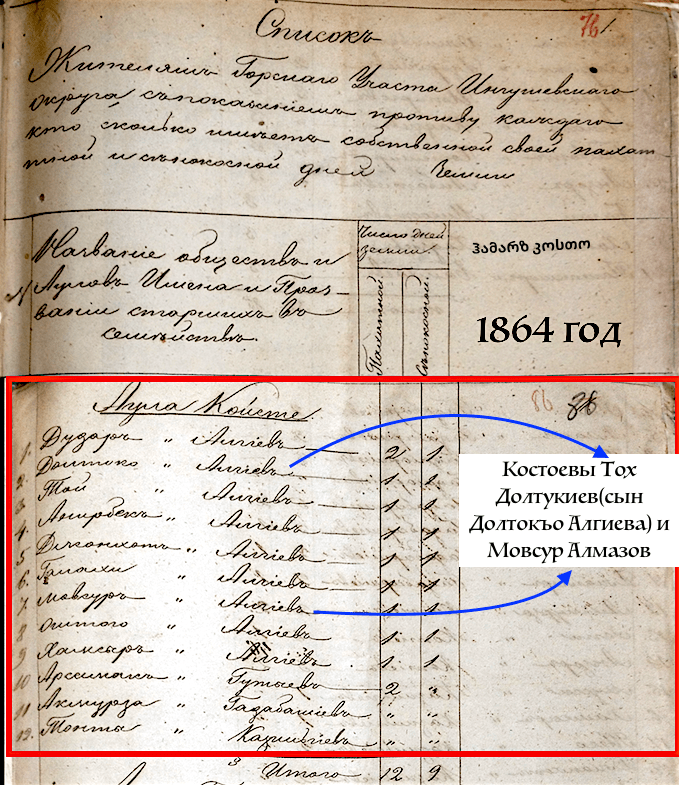 Костоевы в списке проживающих в хуторе Галашки в 1892 году // РСО-А. Ф. 20. Оп. 1. Д. 743. Л. 88-93 об.