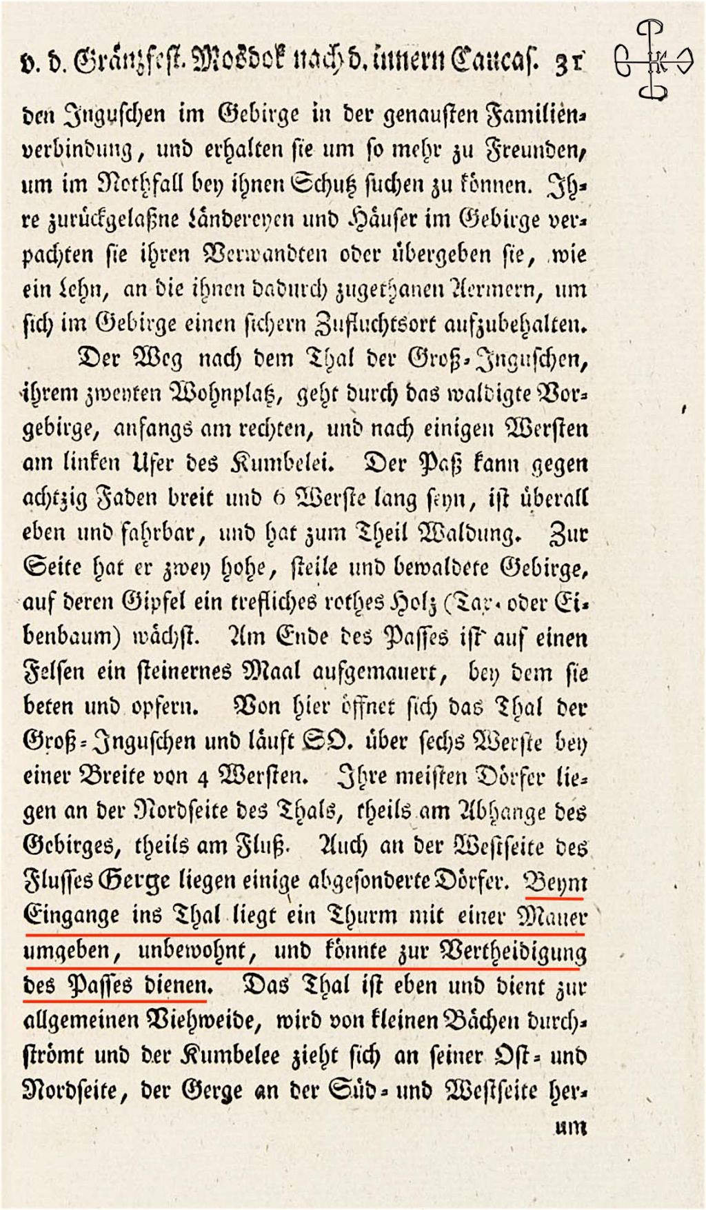 Отсюда открывается долина Больших ингушей и идет на юго-восток свыше шести верст при ширине в 4 версты. Большинство их деревень расположены на северной стороне долины, частично по склону горы, частично по реке. И на западной стороне реки — Герге находятся несколько отдельных деревень. У входа в долину стоит башня, окруженная стеной, незаселенная, она применялась для обороны перевала. Долина ровная и служит для общего выгона скота, пересекается малыми ручьями, а Кумбелей тянется на ее восточной и северной стороне, Герге — по южной и западной стороне, и обе реки объединяются у перевала, вобрав в себя разные малые ручьи. (Beym Eingänge ins Thal liegt ein Turm mit einer Mauer umgeben, unbewohnt, und könnte zur Verteidigung des Paſſes dienen)