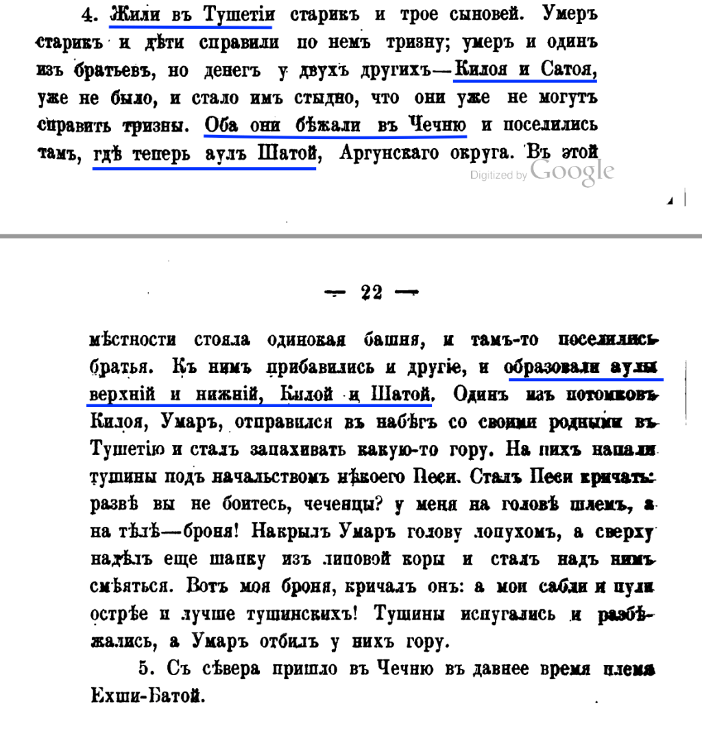 Сборник материалов для описания местностей и племен Кавказа. № 22, Тифлис, 1897 год                        «Жили въ Тушетіи старикъ и трое сыновей. Умеръ старикъ и дѣти справили по немъ тризну; умеръ и одинъ изъ братьевъ, но денегъ у двухъ другихъ Килоя и Сатоя, уже не было, и стало имъ стыдно, что они уже не могутъ справить тризны. Оба они бъжали въ Чечню и поселились тамъ, гдѣ теперь аулъ Шатой, Аргунскаго округа. Въ этой мѣстности стояла одинокая башня, и тамъ-то поселились братья. Къ нимъ прибавились и другіе, и образовали аули верхній и нижній, Килой и Шатой, Одинъ изъ потомковъ Килоя, Умаръ, отправился въ набегъ со своими родными въ Тушетію и сталъ запахивать какую-то гору. На нихъ напали тушины подъ начальствомъ некоего Песи. Сталъ Песи кричать развѣ вы не боитесь, чеченцы? у меня на головв шлемъ, а на тѣлѣ—броня! Накрылъ Умаръ голову лопухомъ, а свергу наделъ еще шапку изъ липовой коры и сталъ надъ нимъ смѣяться. Вотъ моя броня, кричалъ онъ: а мои сабли и пули острѣе и лучше тушинскихъ! Тушины испугались и разбежались, а Умаръ отбилъ у нихъ гору.»