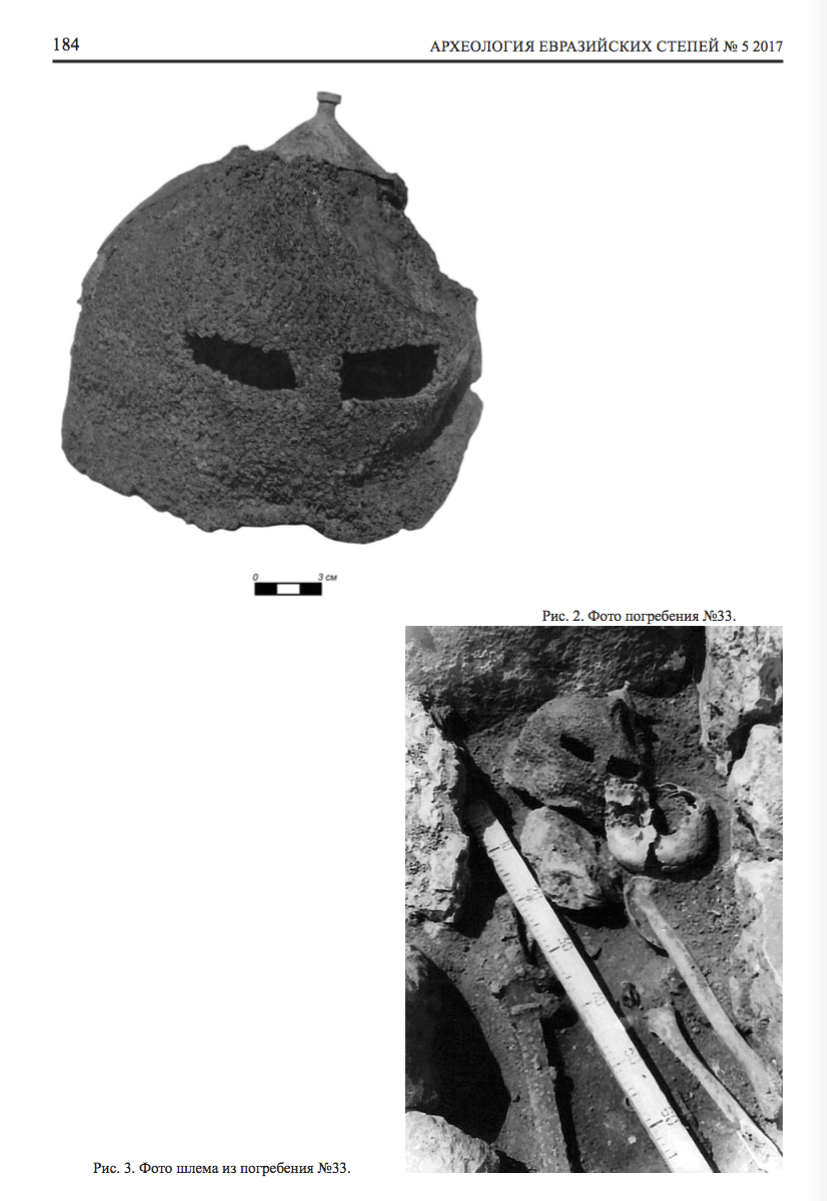 The article introduces into scientific discourse another military burial from Keliya burial ground of the Golden Horde period located in mountain Ingushetia. The helmet lying alongside the buried in a stone box is represented by a specimen made entirely of chain mail, which was worn on the head. A finial on top of the hel- met featured an image of four griffons. The front side of the combat headpiece had sub-rectangular cutouts for the eyes. Whereas the helmet does not have direct and exact counterparts, although in terms of structure it can be related to the ‘mail caps’ from the North-Western Caucasus, the bronze finials have exact counterparts on several helmets from the nomadic burials of the Golden Horde and New Sarai. The counterparts have allowed not only to date the helmet, but also to make several assumptions making it possible to consider it a possible prototype of later headpieces — the so-called ‘misyurkas’.