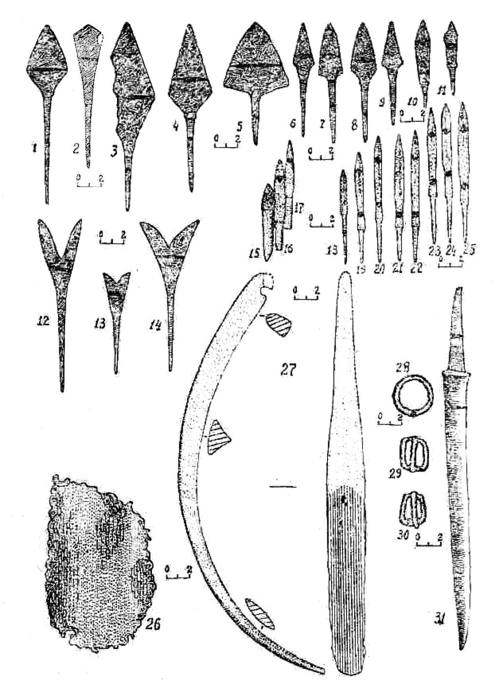 На кольчуге обнаружено 25 железных черешковых наконечников стрел, которые, судя по остаткам истлевшей кожи, располагались внутри черного кожаного колчана. Двенадцать из наконечников плоские, а остальные — граненые (рис. 2, 1—25). Плоские подразделяют на следующие типы: 1) в виде лопаточки с прямо­угольным острием (рис. 2, 2); 2) двурогие — 3 экз. (рис. 2, 12—14); 3) килевидные — 3 экз. (рис. 2, 6, 7, 9); 4.) ножевидный (рис. 2, 8); 5) ромбовидный (рис. 2, 4); 6) ромбовидный крупный (рис. 2. 3); 7) подромбическнй с выпуклыми ударными и вогнутыми нижними гранями (рис. 2, 1); 8) подромбический с вогнутыми ударными к нижними гранями (рис. 2, 5).