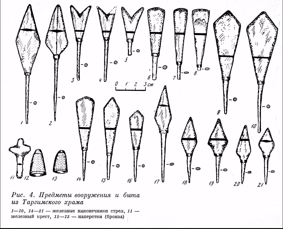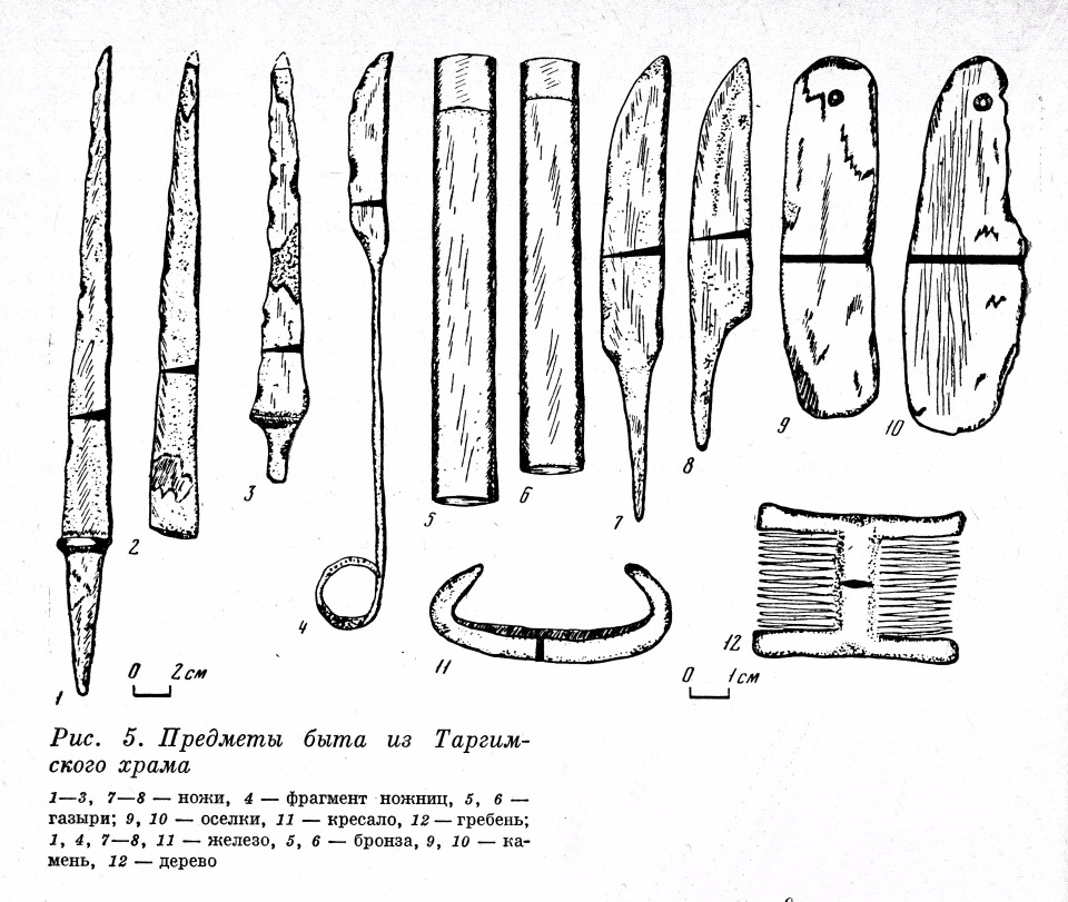 Таковы основные черты конструкции таргимского памятника. Архитектурные формы храма предельно скромны, его внешние массы лишены всяких украшений и декоративных элементов. Интерьер здания скуп и прост. Он фактически украшен лишь поперечной аркой, которая несколько смещена к алтарной части помещения. После освобождения внутреннего пространства храма от завала рухнувшей кровли и части стен на глубину до 1,10 м были произведены раскопки мелкокаменистого наносного слоя толщиной 0,30-0,40 м до уровня древнего пола. На нем образовался своеобразный культурный слой в процессе длительного посещения храма населением горной котловины. Возможных следов покрытия пола храма не отмечено. При раскопках удалось выявить некоторые неизвестные ранее детали в конструкции алтарной части помещения. Так, была вскрыта одноступенчатая каменная солея, отделявшая апси-диальное пространство храма от собственно зала. Ее высота 0,15 м, в плане она пересекает площадь здания по линии выступов апсиды. Здесь же, под алтарным окном открыты остатки престола (?) квадратной формы (0,60X Х0,60 м, сохранившаяся высота 0,15 м), сложенного из камней на известковом растворе. При исследовании культурного слоя выявлены материалы, которые не столь многочисленны, однако достаточно конкретны для определения времени строительства и продолжительности функционирования Таргимского храма, а также для обоснования совершавшегося здесь некогда обряда жертвоприношений. Как показали раскопки, многовековой культурный слой храма по всей площади и глубине был насыщен (особенно по углам здания) костными остатками жертвенных животных. Встречены они и на расчищенном древнем полуматерике. По остеологическим признакам кости принадлежали турам, баранам, быкам и оленям. Эти животные, наиболее почитавшиеся вайнахами с глубокой древности, приносились в дар языческим божествам, пантеон которых, таким образом, не был забыт даже в период активного проникновения новой, христианской религии на территории Чечено-Ингушетии. Находки представлены предметами вооружения и быта. В алтарной и зальной частях храма, соответственно на древнем основании (солее) и на полу-материке, обнаружены при раскопках железные черешковые наконечники стрел. Все они плоские, по своей форме подразделяются на роговидные, лопаточкообразные, веслообразные и удлиненно-ромбовидные. Каждый тип наконечников найден в двух экземплярах (рис.4, 1-4, 6, 7, 9,15). Предметы быта собраны в зальной части памятника, на поверхности культурного слоя. Следует упомянуть два железных черенковых ножичка с прямым и закругленным лезвиями, два газыря с костяными оправами (для хранения пороха и пуль), железное С-образное кресало и плоский каменный оселок с круглым отверстием в верхней части (рис.5, 5-9, 11). Таковы материалы, собранные внутри храма. Склеповая усыпальница, содержавшая коллективные погребения, оказалась ограбленной. Она была заполнена землей и камнями, в ней сохранились остатки разрозненных человеческих костей. При расчистке открыт впущенный по центру в основание камеры на глубину 0,30 м удлиненный каменный ящик без сохранившегося перекрытия, которое было снято кладоискателями. Ящик вытянут по длине камеры и примыкает к восточной стене, сложен из поставленных на ребро и тщательно подогнанных одна к другой плоских каменных плит (длина 3,90 м, 