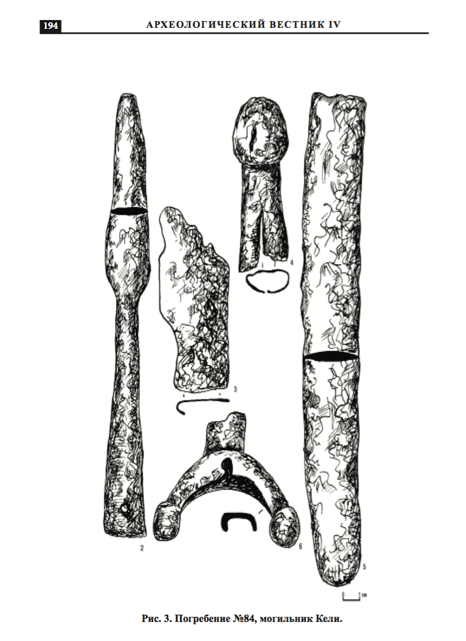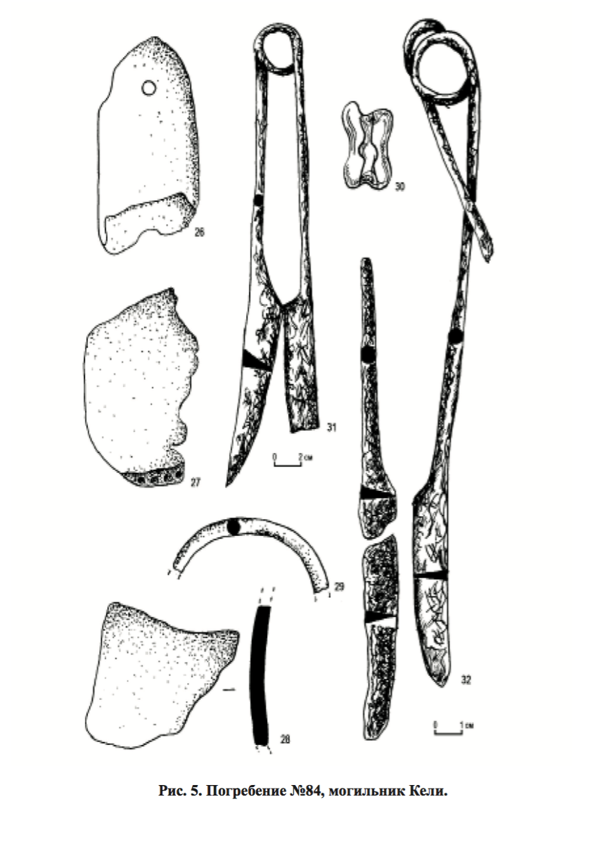 В связи с публикацией навершия рукояти от сабли из погребения 84 Келийского могильника, укажем на находки еще трех точно таких же наверший, изготовленных из обожженной глины (неопубликованные материалы Шуанского, Эгикальского и Келийского склепов). Копируя форму металлических наверший, указанные их керамические дериваты, скорее всего, изготавливались специально (?) для погребального ритуала (?).