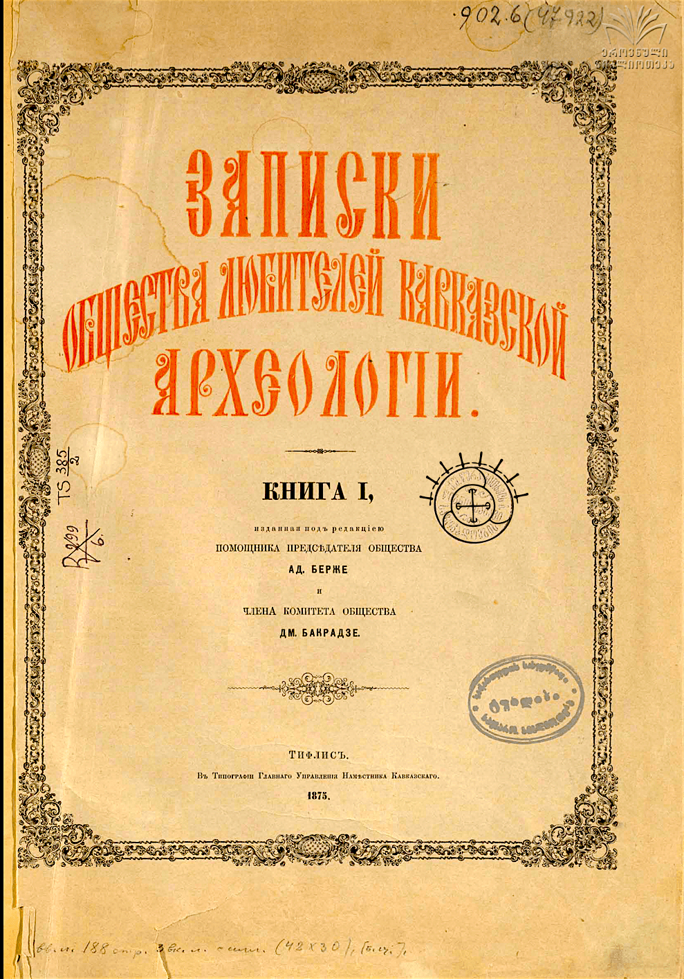 «В пространном сферическом треугольнике, окруженном как бы выпуклой рамою (валиком), представлены в середине человек, по-видимому, сидящий на седалище, с моделью церкви на голове; по бокам его две стоящие фигуры — правая (от зрителя) держит в левой руке крест, а правую положила на рукоять меча; левая фигура в епитрахили и с кистями винограда на плечах; около изображения модели храма сбоку на плите высечена рука, держащая наугольник; над правой фигурой с крестом вделана плита с плохо сохранившейся грузинской надписью, и такая же надпись помещается с левой стороны, несколько выше первой. В той же западной стене, по обеим сторонам среднего барельефа, вделаны плиты с изображениями двух ангелов; НАД БАРЕЛЬЕФОМ — ПОД КОНЬКОМ — ЕЩЕ ОДНА ПЛИТА С НЕЯВСТВЕННОЙ ЧЕЛОВЕЧЕСКОЙ ФИГУРОЙ, С РУКОЙ НА РУКОЯТИ МЕЧА».