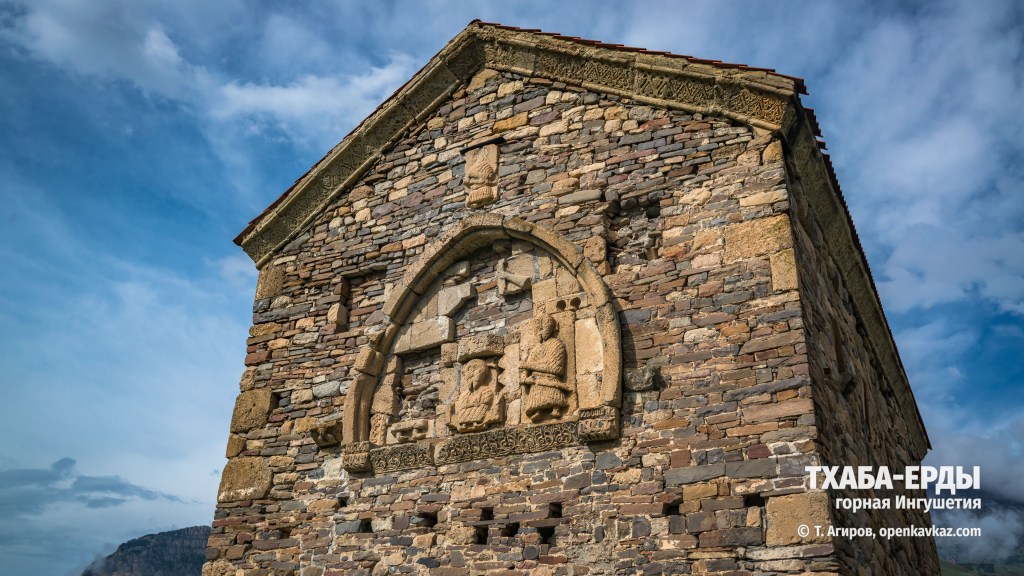 Теперь частично сохранилась лишь правая часть композиции: две фигуры-сидящего человека и человека с мечом. Крест выломан, уничтожен и барельеф с ангелом. Снизу, по бокам барельефа, из стены выступают еще два кронштейна с изображением святого и с растительным орнаментом. (Из книги «От Терека до Ассы», Марковин., 1969 год)