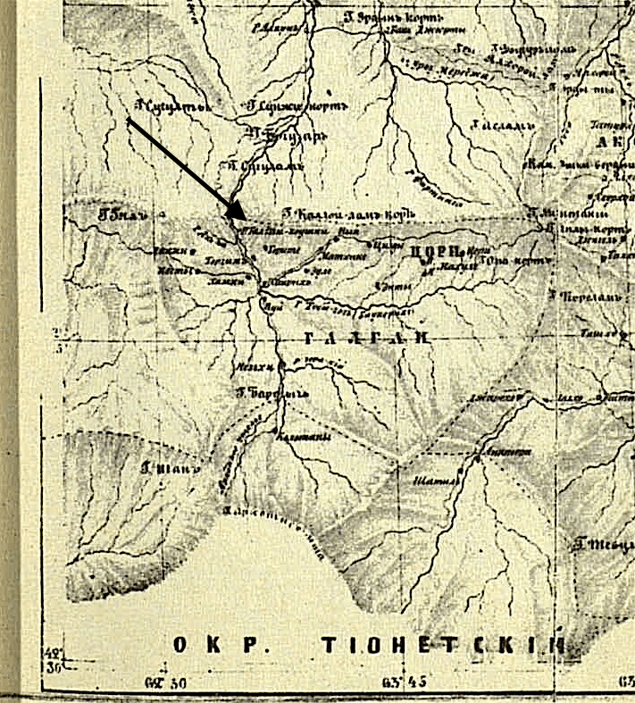 Галгай Коушки (галгайские заставы) на карте Адольфа Берже // «Чечня и Чеченцы», А.П. Берже, Тифлис. 1859 год // источник: Библиотека Президента РФ » Карта Берже