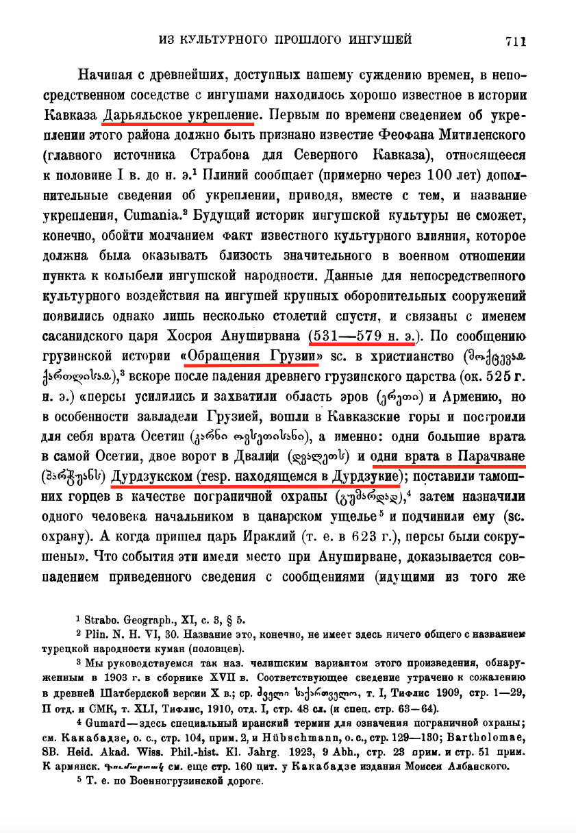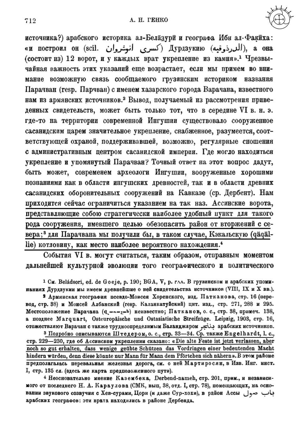 «Иногда сопоставление известного исторического факта с данными фольклора позволяют делать совершенно новые выводы или изменить оценку фактов, считавшихся установленными. V томе «Известий востоковедов при Академии наук», в статье Генко «Из культурного прошлого ингушей» упоминается о вратах персидского царя Ануширвана, которые находились где-то в районе Ассинского ущелья. Персидский царь Ануширван, о котором упоминает Генко, жил в VIII веке.