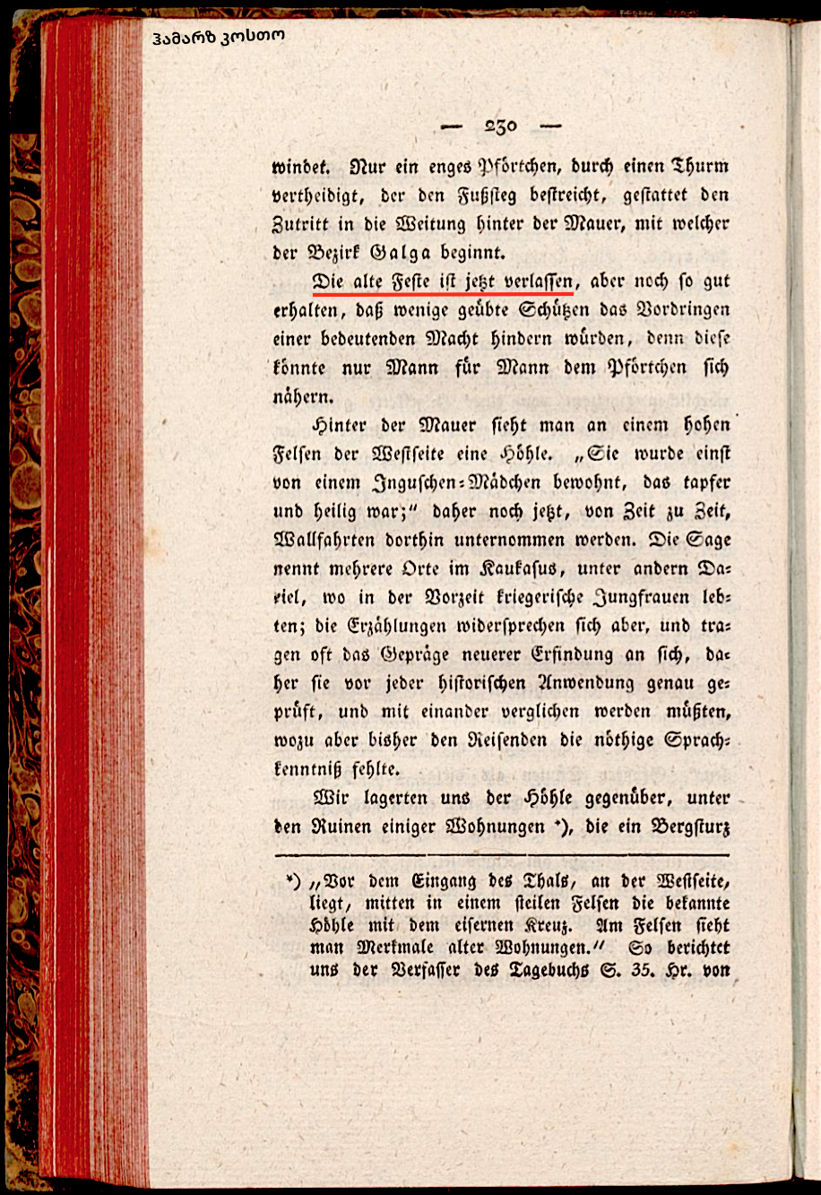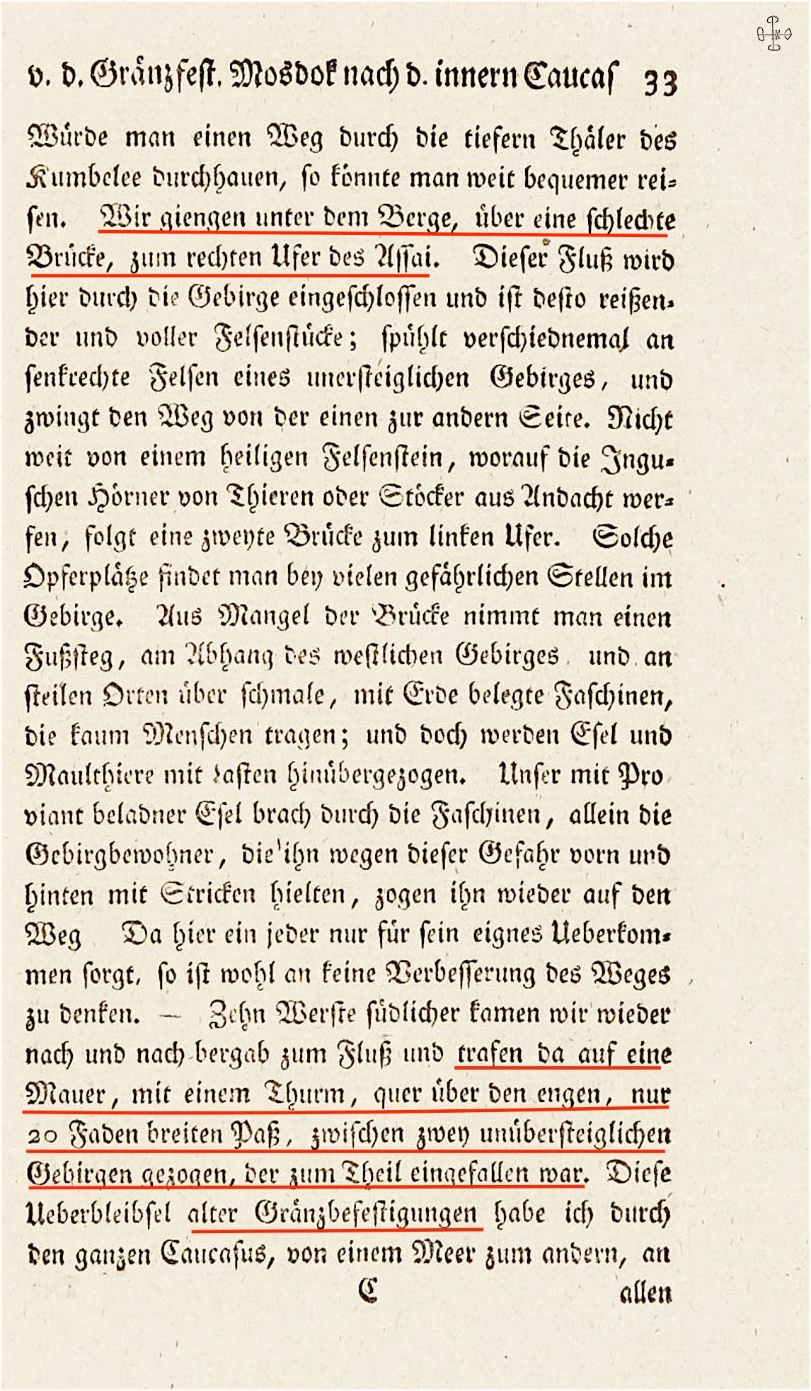 Мы шли под горой, через хилый мост, к правому берегу Ассая. Эта река запирается здесь горами и становится тем более стремительной и полной скальных осколков; многократно набрасывается на отвесные скалы неприступной горы и поворачивает дороги с одной стороны на другую. Недалеко от священного скального камня, на который ингуши бросают рога животных или палки для молитвы, расположен второй мост на левый берег. Такие жертвенные места находят во многих опасных местах в горах. Из-за отсутствия моста идут пешеходной тропой, у склона западной горы и в обрывающихся местах по узким, обложенным землей фашинам, которые едва удерживают людей; и все же ослов и мулов проводят с грузами. Наш нагруженный провиантом осел сорвался с фашин, однако горцы, которые придерживали его из-за этой опасности веревками спереди и сзади снова вытащили его на дорогу. Поскольку здесь каждый заботится только о своем собственном благополучии, то, по-видимому, и нечего думать о каком-то улучшении дороги. Через десять верст южнее мы снова постепенно пришли вниз к реке и натолкнулись здесь на стену с уже частично обвалившейся башней, протянувшейся поперек через узкий перевал, шириной всего в 20 саженей, между двумя неприступными горами. ЭТИ ОСТАТКИ СТАРЫХ ПОГРАНИЧНЫХ УКРЕПЛЕНИЙ я находил по всему Кавказу, от одного моря до другого на всех переходах через горы, на самых узких перевалах.