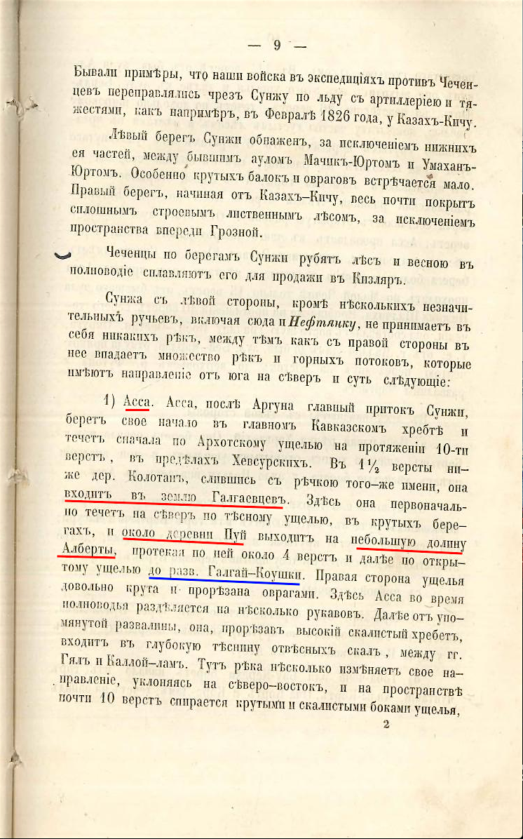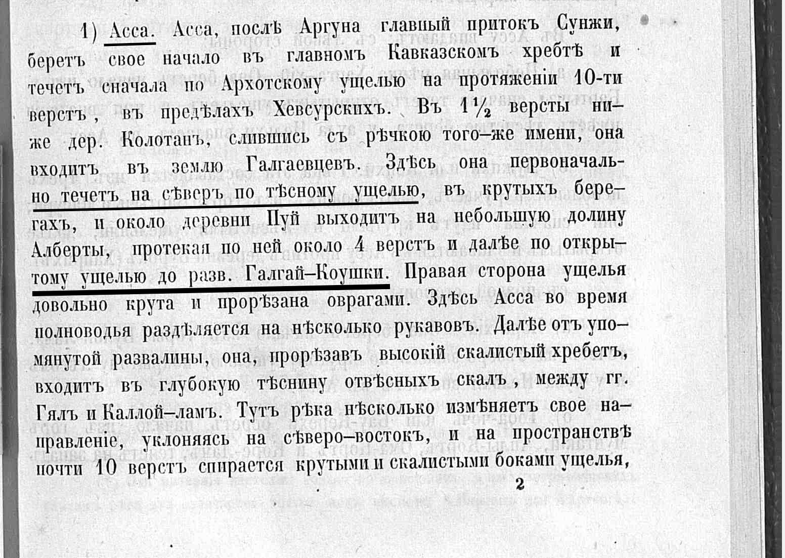 Асса, после Аргуна главный приток Сунжи, берет свое начало в главном Кавказском хребте и течет сначала по Архотскому ущелью на протяжении 10-ти верст, в пределах Хевсурских. В 11⁄2 версты ниже дер. Колотан, слившись с речкою того же имени, она входит в землю Галгаевцев. Здесь она первоначально течет на север по тесно- му ущелью, в крутых берегах, и около деревни Пуй выходит на небольшую долину Алберты, протекая по ней около 4 верст и далее по открытому ущелью до разв. Галгай-Коушки. Правая сторона ущелья довольно крута и прорезана оврагами. Здесь Асса во время полноводья разделяется на несколько рукавов. Далее от упомянутой развалины, она, прорезав высокий скалистый хребет, входит в глубокую теснину отвесных скал, между гг. Гял и Каллой-лам. Тут река несколько изменяет свое направление, уклоняясь на северо-восток, и на пространстве почти 40 верст спирается крутыми и скалистыми боками ущелья, покрытого густым лесом.
