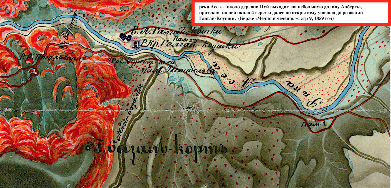 Отсюда открывается долина Больших ингушей и идет на юго-восток свыше шести верст при ширине в 4 версты. Большинство их деревень расположены на северной стороне долины, частично по склону горы, частично по реке. И на западной стороне реки — Герге находятся несколько отдельных деревень. У входа в долину стоит башня, окруженная стеной, незаселенная, она применялась для обороны перевала. Долина ровная и служит для общего выгона скота, пересекается малыми ручьями, а Кумбелей тянется на ее восточной и северной стороне, Герге — по южной и западной стороне, и обе реки объединяются у перевала, вобрав в себя разные малые ручьи. (Beym Eingänge ins Thal liegt ein Turm mit einer Mauer umgeben, unbewohnt, und könnte zur Verteidigung des Paſſes dienen)