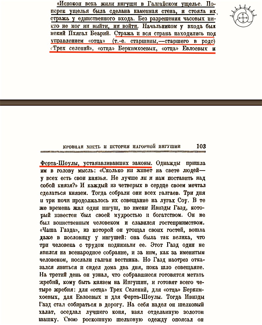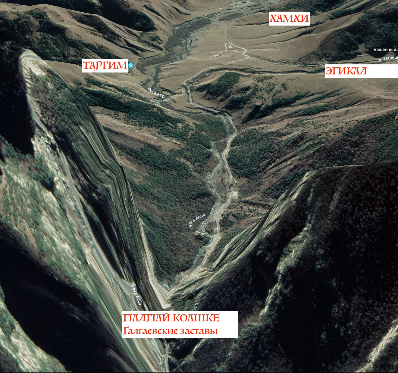 «Испокон века жили ингуши в Галгайском ущелье. Поперек ущелья была сделана каменная стена, и стояла их стража у единственного входа. Без разрешения часовых никто не мог ни выйти, ни войти. Стража и вся страна находилась под управлением «отца» (старшего)»Трех селений» (ЭГИ,ТАРГИМ, ХАМХИ), «отца» Баркинхоевых, «отца» Евлоевых и Ферта Шоулы» (Яковлев Н. Ингуши. Популярный очерк. М-Л., 1925. страница 103)