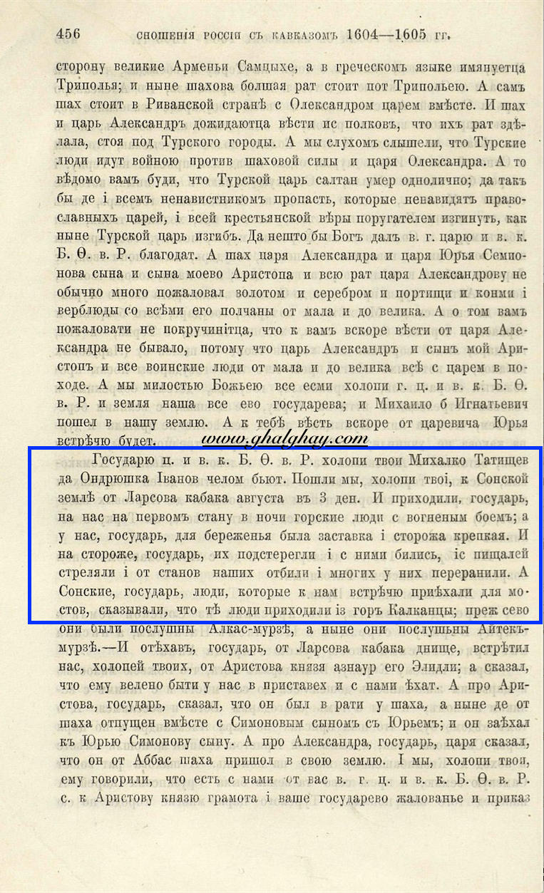 1590 г. мая 27. — Из статейного списка русских послов в Кахетию князя С. Г. Звенигородского и дьяка Т. Антонова о нападении на них в горах на пути из Кахетии в Терский город «горних людей» калканцев (Галгаевцев)