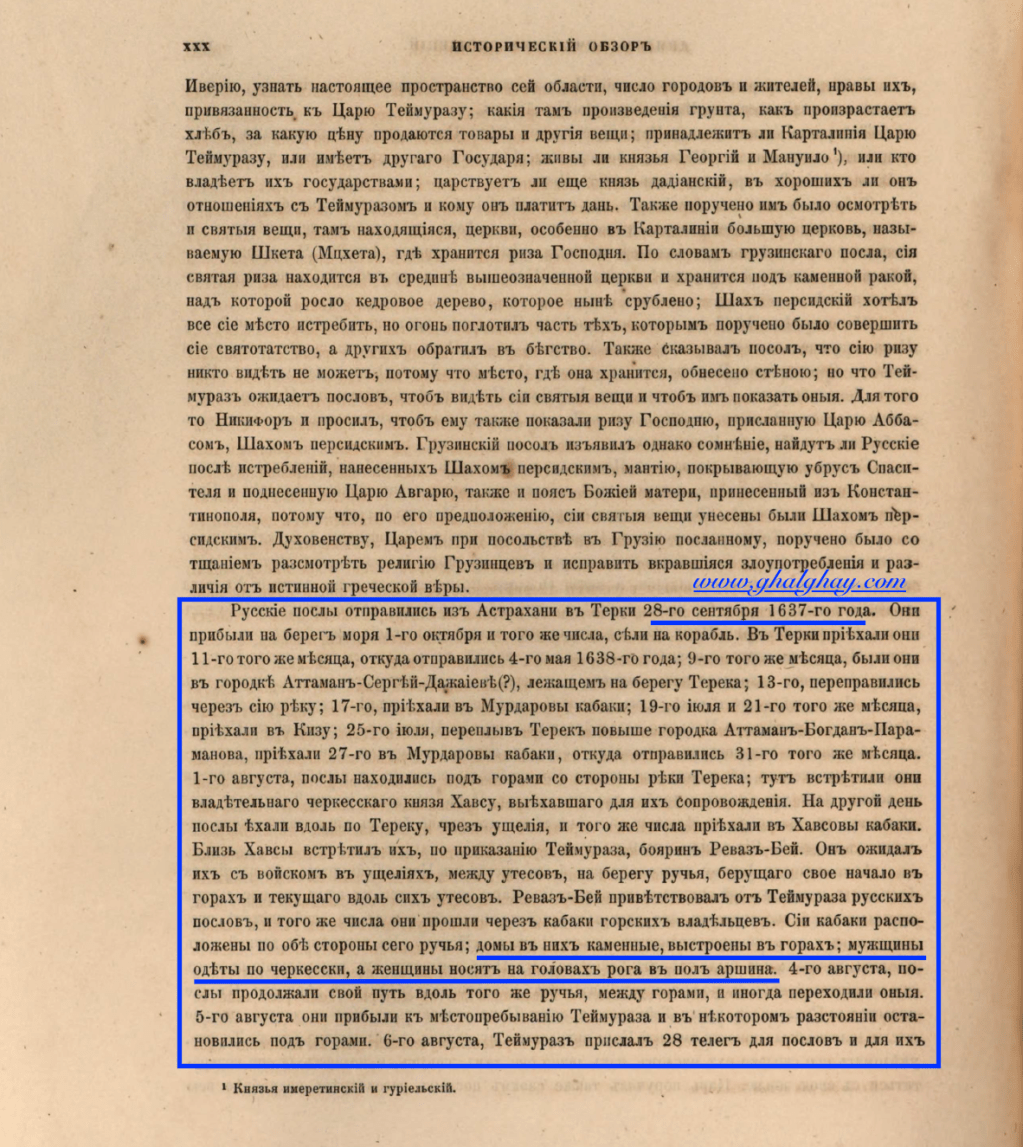 1638 г. июля 19 — августа 12, — Из статейного списка русских послов князя Ф. Ф. Волконского и дьяка А. И. Хватова о пути посольства к кахетинскому царю Теймуразу от Терского города до села Лопантис в Кахетии