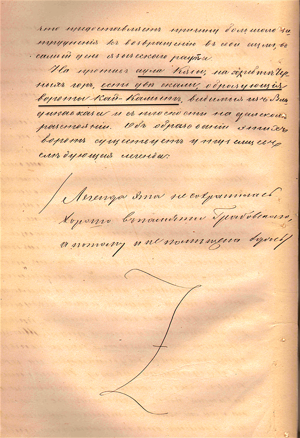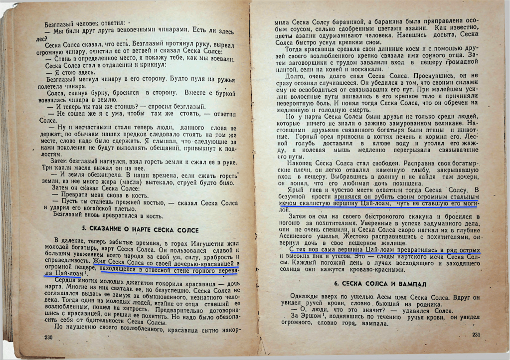 «Напротив аула Кязы, на хребте Черных гор, есть две скалы, образующие вороты КАЙ-КАМЫТ, видимые из Владикавказа и с плоскости на далекое расстояние. Об образовании этих ворот существует у туземцев следующая легенда: (Легенда эта не сохранилась хорошо в памяти Грабовского и потому и не помещена здесь)» ОТ РЕДАКЦИИ САЙТА : ЛЕГЕНДА О РАСКОЛОТОЙ ГОРЕ «Место, по которому Сеска Солса ударил саблей (мечом)» («Сеска Солсас тур теха моттиг») (СЕСКА СОЛСА-герой ингушских сказок ОРХУСТОЙ (не путать с карабулаками и арштхоевцами))