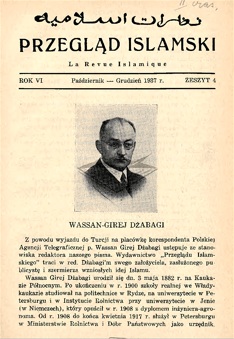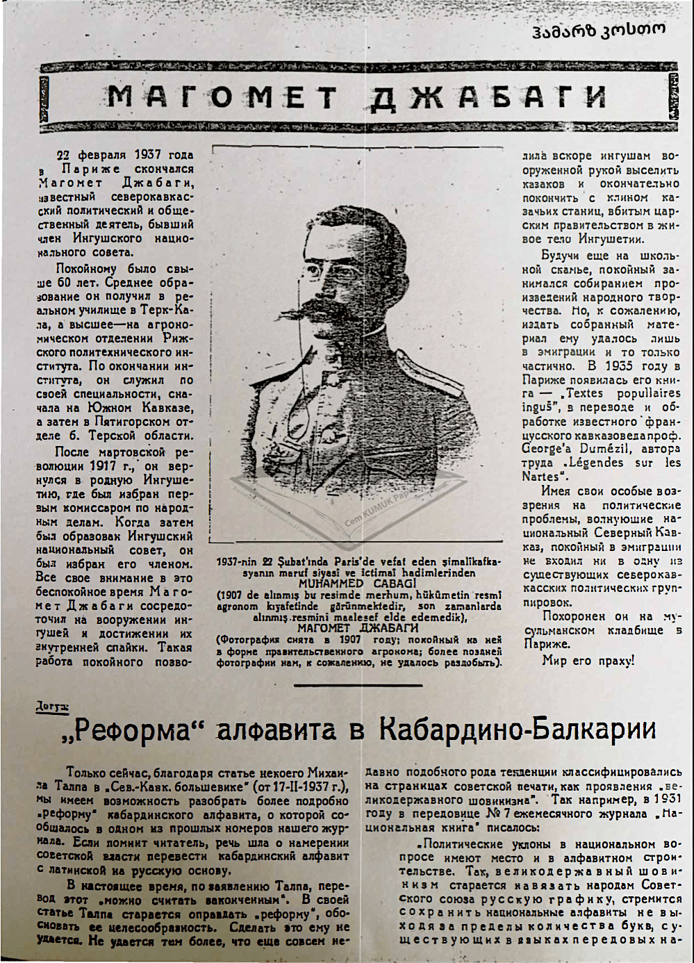 В разных периодах жизни в Петербурге, Париже, Варшаве и Стамбуле их пути несколько раз пересекались, Исхаки был вхож в семью Джабагиева и учил его детей. Об этом свидетельствуют статья В.-Г. Джабагиева и воспоминания его дочери Тамары Джабаги-Джанкат Камаджыоглу. Гаяз Исхаки (1878–1954) и Вассан-Гирей Джабагиев (1882–1961) – великие личности татарского и ингушского народов, два крупных лидера политической эмиграции – были соратниками и единомышленниками, однако информации об их взаимоотношениях крайне мало. До сих пор не проведено ни одного специального исследования по этому вопросу. Недавно обнаруженная публикация В.-Г.Джабагиева [4] (more…)