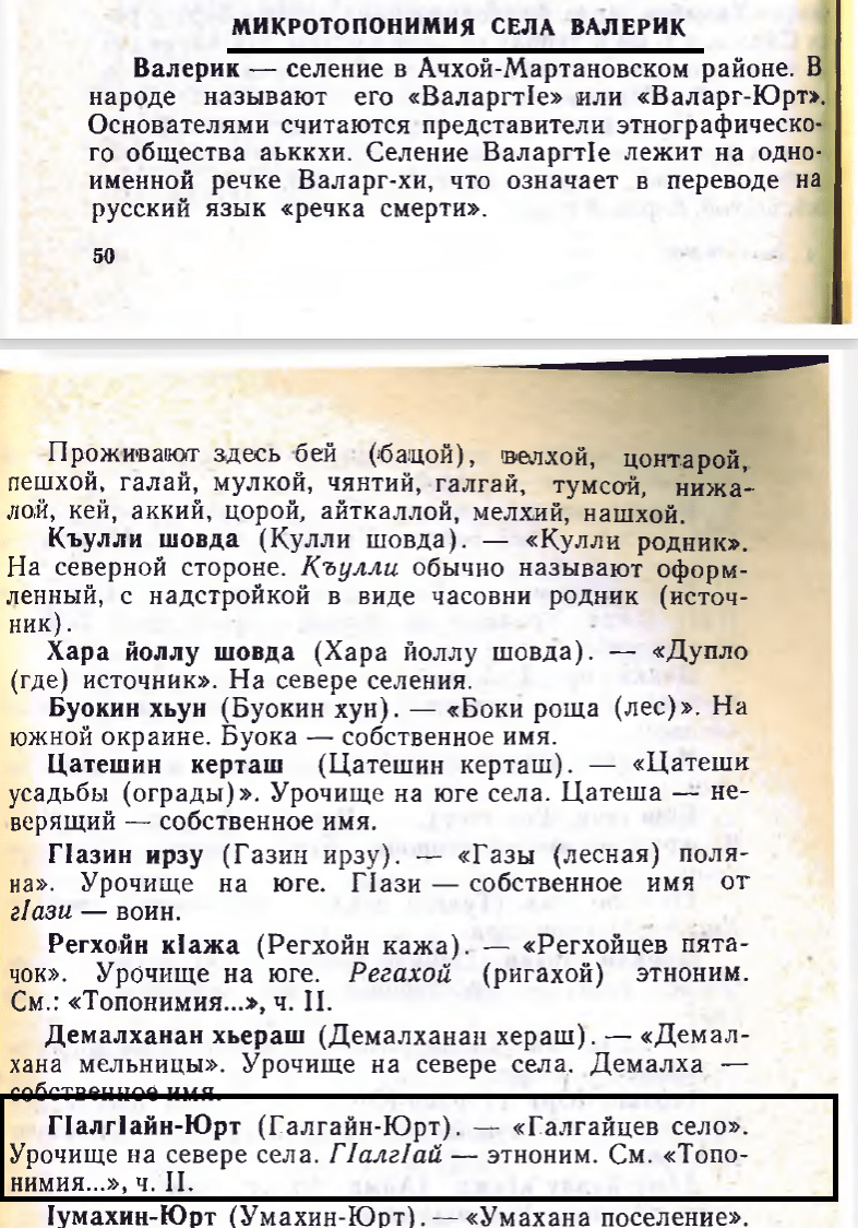 Галгай-юрт в микротопонимии села Валерик/ Топонимия Чечено- Ингушетии, III часть, 1980 год