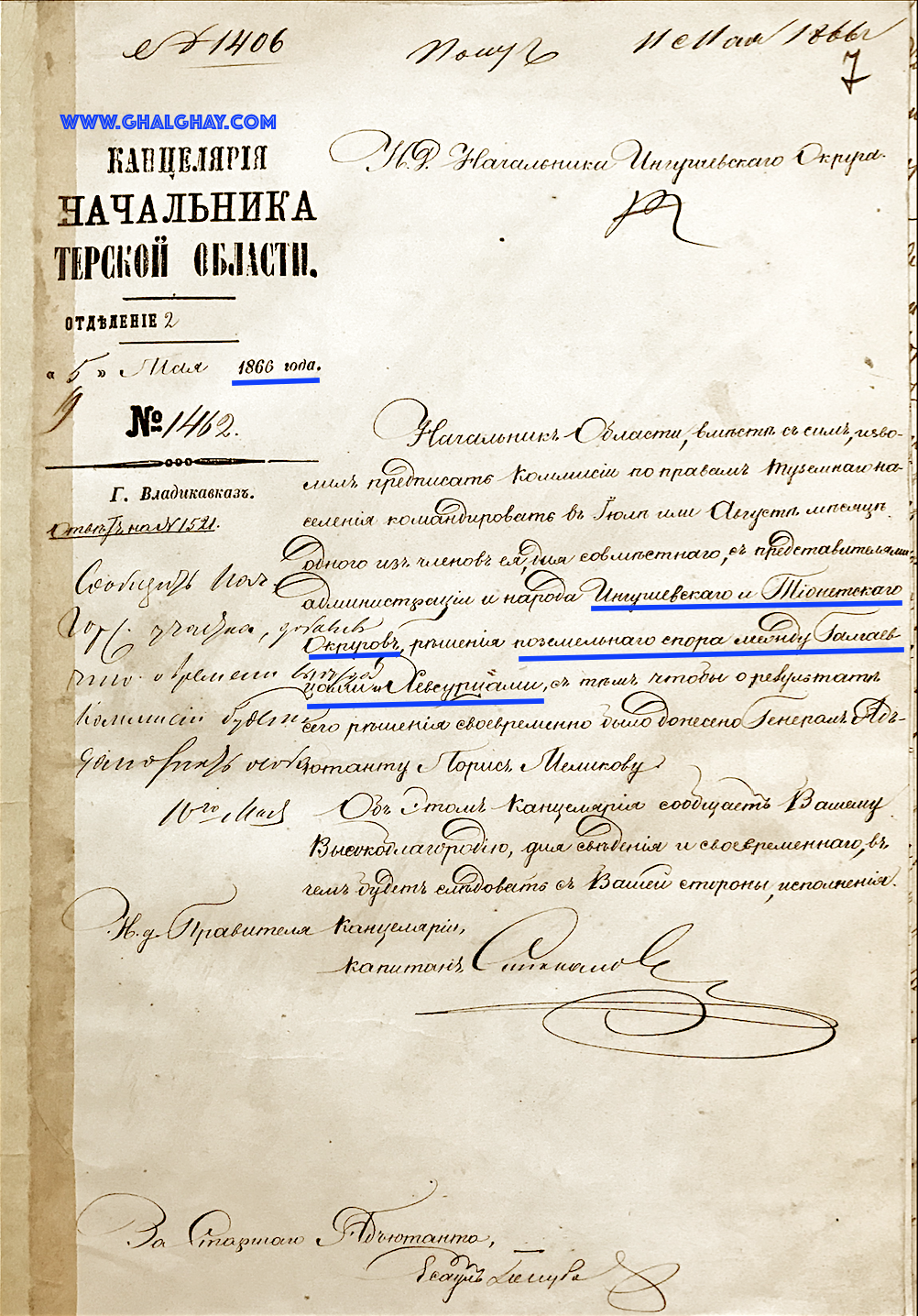 Кобанской старшина Мурза-бек Тулатов, призжая ко мне, объявлял двукратно, так как он и подданные его были прежде веры Греческого исповеданія, а хотя он пред сим имел по случаю происходящего по ущельям бунта, по угодности Большой Кабарды отъ Христіанскаго закона отвращенія и по склоненію главнаго мятежника Дударуко Дударова, который настоял Христіанскій закон от народа, живущаго по ущельям, отвергнуть, с тем, если кто у них содержитъ Магометанскую веру, тому дают преимущество и считают наравне с старшинами, а тех которые содержут Христіанскую веру, считают их подданными, по коему поводу МНОГИЕ ОСЕТИНЦЫ ПО УЩЕЛЬЯМ СДЕЛАЛИ ОТВРАЩЕНИЕ ОТ РЕЛИГИИ ХРИСТИАНСКОГО ЗАКОНА и не имели при том священников, которые бы их поддержать и к разврату допустить не могли, каковых правил и он доныне держался и делал с ними, подражая им по наружности, А БУДТО ОН, ТУЛАТОВ НЫНЕ ВНУТРЕННО ВОЗЧУВСТВОВАЛ СВОЕ ЗАБЛУЖДЕНИЕ , ЖЕЛАЕТ ПАКИ ВОЗОБНОВИТЬ ВЕРУ ГРЕЧЕСКОГО ИСПОВЕДАНИЯ СО ВСЕМИ СВОИМИ ЖИТЕЛЯМИ , С ТЕМ ЧТОБЫ ЕМУ ПОЗВОЛЕНО БЫЛО ПОСЕЛИТЬСЯ ПРОТИВ ВЛАДИКАВКАЗСКОЙ КРЕПОСТИ ЗА ТЕРЕКОМ НА ЧЕРНОЙ РЕЧКЕ КОИХ БУДЕТ СЕЛЕНИЯ ЕГО ДО 100 ДВОРОВ, ПРОСЯ ПРИ ТОМ МЕНЯ ДАБЫ Я ИСХОДАТАЙСТВОВАТЬ ОПРЕДЕЛИТЬ ИМ СВЯЩЕННИКА И ЦЕРКОВЬ, КОТОРОЙ БЫ НА ОСЕТИНСКОМ ИХ ЯЗЫКЕ МОГ ИСПОЛНЯТЬ СЛУЖБУ, ИБО В ХРИСТИАНСКУЮ ВЕРУ КРОМЕ ИХ ОБРАТИТЬСЯ ЖЕЛАЮТ КОТОРЫЕ НЕ ЗАВИСЯТ НИ ОТ КОГО ПОДДАНСТВОМ , ПО ЕГО УВЕРЕНИЮ ДОВОЛЬНОЕ ЧИСЛО, ПО ВИДИМОСТИ ЧЕГО ОКРУЖАЮЩИЙ В ОКРЕСТНОСТИ ВЛАДИКАВКАЗА ГОРСКИЙ ЗАБЛУЖДЕННЫЙ НАРОД,