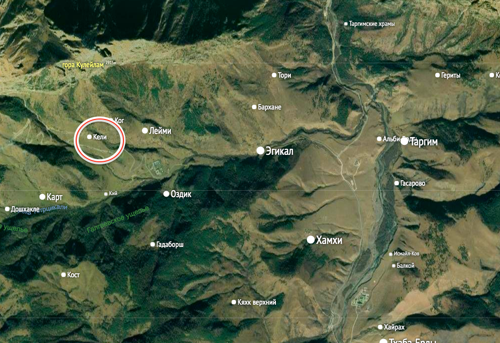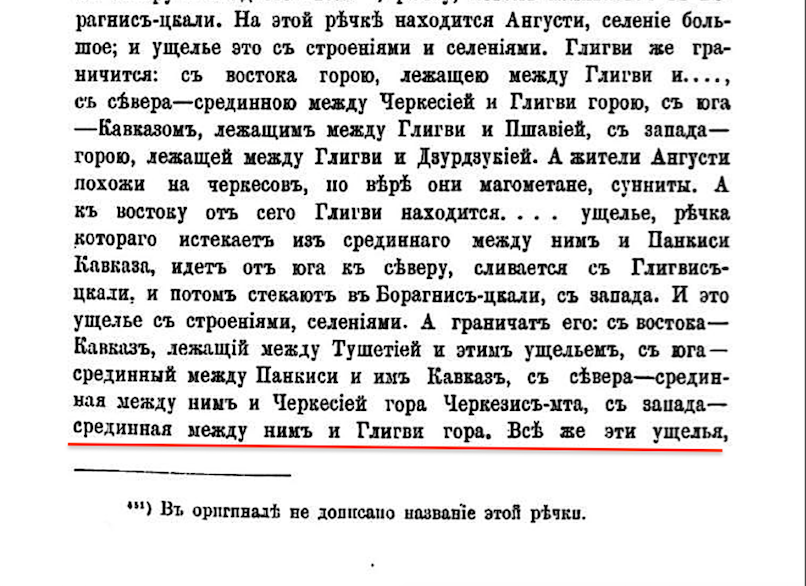 A l’ouest de la Vallée du Moukii, il faut franchir une montagne escarpée , pour arriver dans la vallée du Koumbaley, où habite la tribu ingouche de GHALGAI [GHLIGHWI en géorgien ] ; elle dérive son nom d’un petitfils de DSOURDSOUKOS -К западу от горной долины Моуки (мохевцы), вы должны пересечь крутую гору, чтобы добраться до долины Кумбалей, где проживает ИНГУШСКОЕ племя ГIАЛГIАЙ (GHLIGHWI (ГЛИГВИ) на грузинском языке); оно получило свое название от имени внука DSOURDSOUKOS (ДЗУРДЗУКОСА)