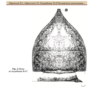 В статье вводится в научный оборот еще одно воинское захоронение Келийского могильника золотоордынского времени из горной Ингушетии. Шлем, сопровождавший погребенного в каменном ящике, представлен экземпляром, полностью изготовленным из кольчужной сетки, надевавшейся на голову. Сверху шлем венчало бронзовое навершие с изображением 4-х птиц-грифонов. На лицевой стороне боевого наголовья – подпрямоугольные вырезы для глаз. Если шлем не имеет прямых и точных аналогий, хотя его конструктивно можно соотнести с «кольчужными шапочками» Северо-Западного Кавказа, то бронзовые навершия имеют точные аналогии на нескольких шлемах из кочевнических захоронений эпохи Золотой Орды и из Нового Сарая. Аналоги не только датируют публикуемый шлем, но и позволяют сделать несколько предположений, позволяющих рассматривать его и как возможный прототип более поздних наголовий – т.н. «мисюрок».
