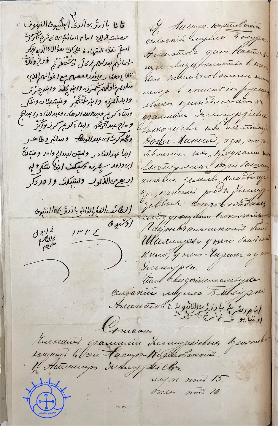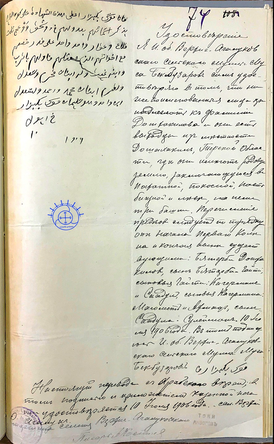 В том подписываю И. об. Верхне-Ачалуковского сельского муллы Муса Бекбузаров. Настоящий перевод с арабского верен; в том подписано и приложением казенной печати удостоверяется 10 июля 1906 года. Сел. Верхний-Ачалук.