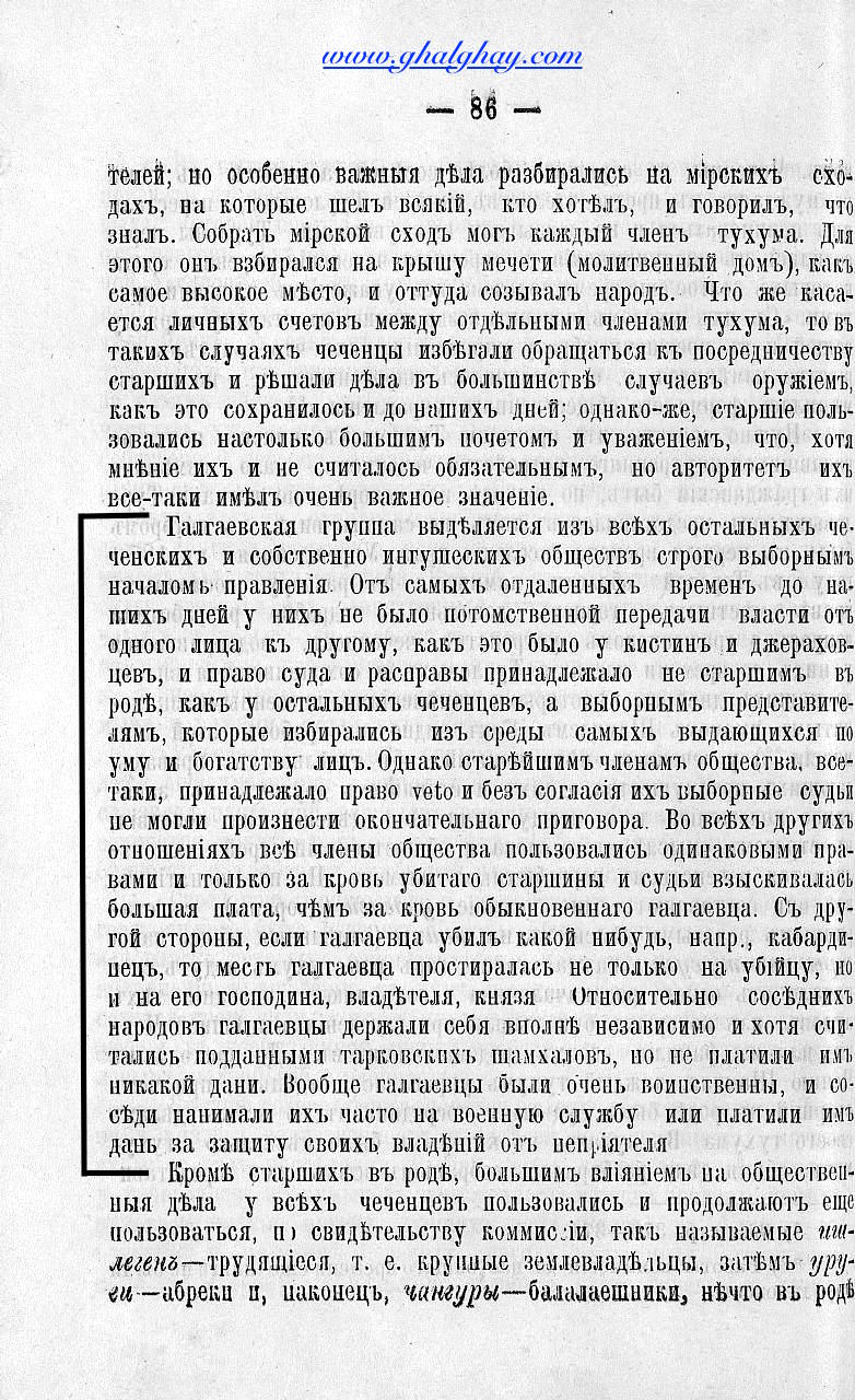 Но раньше Тхаба-ерда играло въ жизни ингушей весьма важную роль. Тамъ они просили покровительства боговъ, нередко оно служило суда божьяго, его именемъ клялись. Туда-же сходились жители сосъднихъ обществъ для дълъ самыхъ серьезныхъ, общественныхъ, имъющихъ внутренній или внешний интересъ для целого народа.