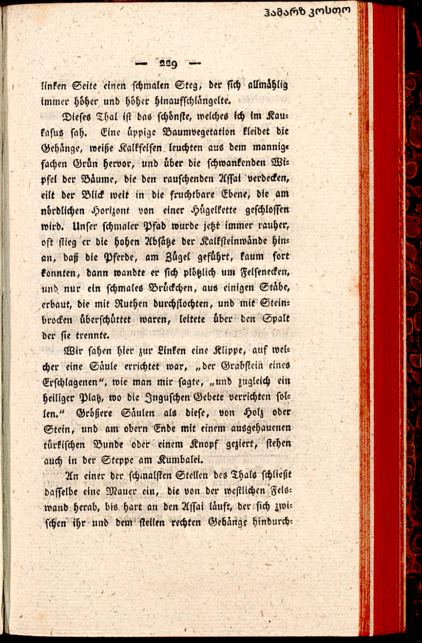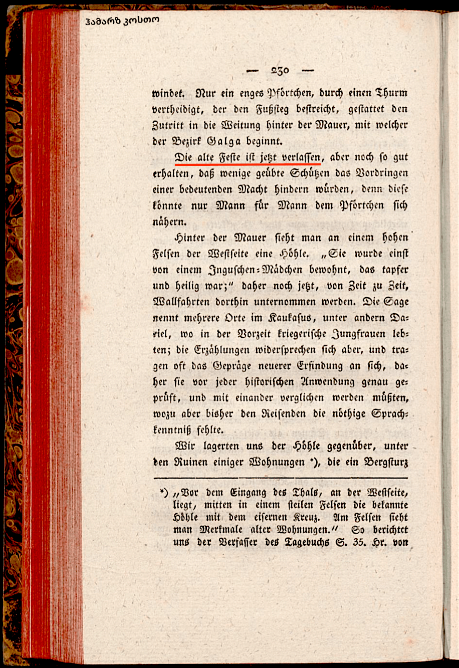 Наша маленькая тропа поднималась по высоким уступам известковых скал, становясь влажной, так, что лошади, ведомые за узды, могли упасть; затем тропа неожиданно повернулась вокруг угла скалы, и только узкий мостик, построенный из нескольких бревен, переплетенных прутьями и присыпанных каменными обломками, вел через трещину, которая ее разделяла. Слева мы увидели утес, на котором была сооружена колонна, «надмогильный камень убитого», как мне сказали, «к тому же святое место, где ингуши должны исполнять молитвы». Большие колонны, чем эта, из дерева или камня, конец которых наверху украшен высеченным турецким тюрбаном или набалдашником, стоят также в степи на Кумбелее. В узком месте долина запирается стеной, которая идет сверху вниз от западной отвесной скалы вплотную к Ассай, которая протекает между нею и крутым правым склоном. Только узкие ворота, защищенные башней, которая касается тропинки, разрешает доступ, в расширение позади стены, с которой открывается район Галга. Старая крепость сейчас оставлена, но еще в хорошем состоянии, так что несколько опытных стрелков могут препятствовать проникновению значительной силы, так как к воротам можно приблизиться, только следуя друг за другом.За стеной, на -западной стороне высокой скалы, видно пещеру. В ней обитала когда-то девушка-ингушка, которая была храброй и святой, туда еще и теперь время от времени предпринимаются паломничества. Сказания называют некоторые места на Кавказе, между прочими и Дарьял, где в старину жили воинственные девушки, но рассказы противоречивы и носят на себе отпечатки новейших выдумок, поэтому при использование их, они должны точно проверяться и сравниваться друг с другом, для чего до сих пор путешественникам не хватало знаний языка. Мы расположились напротив пещеры, между руинами нескольких жилищ, которые были разрушены горным обвалом. Мои проводники держали совет, как безопаснее привести меня к церкви. Одежда могла защитить только там, где мы быстро проходили мимо, но здесь в деревне, где мы должны были переночевать, прежде чем достигли цели путешествия, встреча с жителями сильно заселенной долины была неизбежной, и я тогда выдал бы себя. Поэтому решили выдать меня за депутата генерала Дель Поццо, который должен был заключить мир с до сих пор враждебными деревнями Галга и склонить их к выдаче заложников. Это поручение действительно было отдано моим проводникам, они использовали его с хорошим успехом, чтобы подавить недоверие, которое должно было возбудить мое появление. (more…)