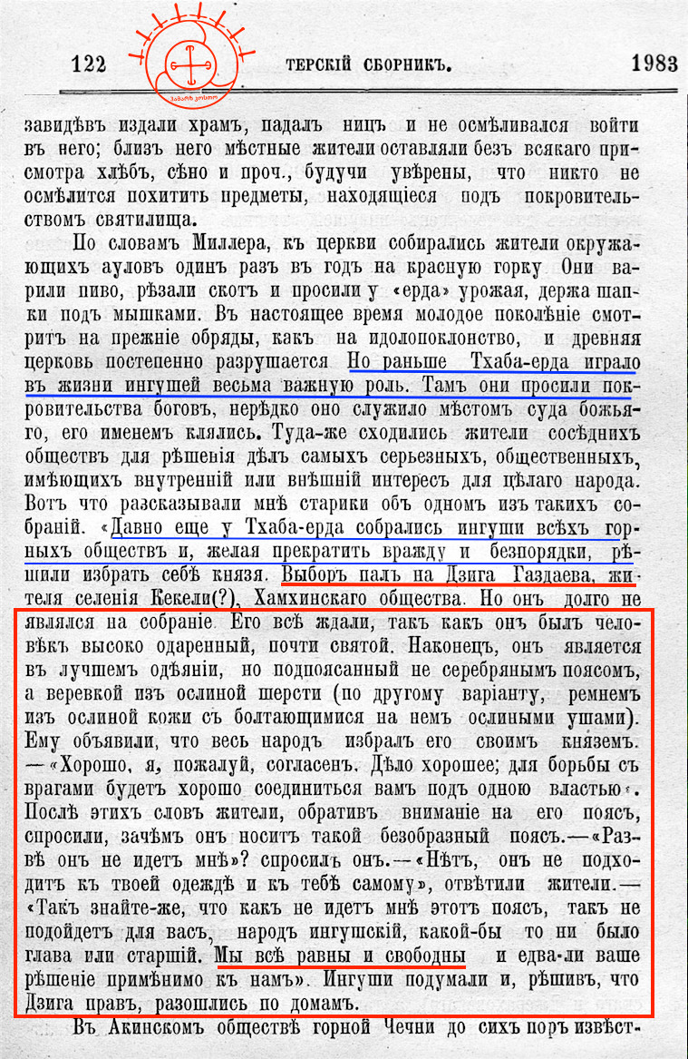 «Давно еще у Тхаба-ерда собрались ингуши горныхъ обществъ и, желая прекратить вражду и безпорядки, ръшили избрать себъ князя. Выборъ пал на Дзига Газдаева (от Редакции сайта ИВИЗД Г1АЗД: — родоначальник фамилий Газдиевых, Базоркиных, Шишхановых, Ужаховых, Тангиевых, Джандиговых, Базгиевых), жителя селенія Кекели(Кхаькхале), Хамхинскаго общества.