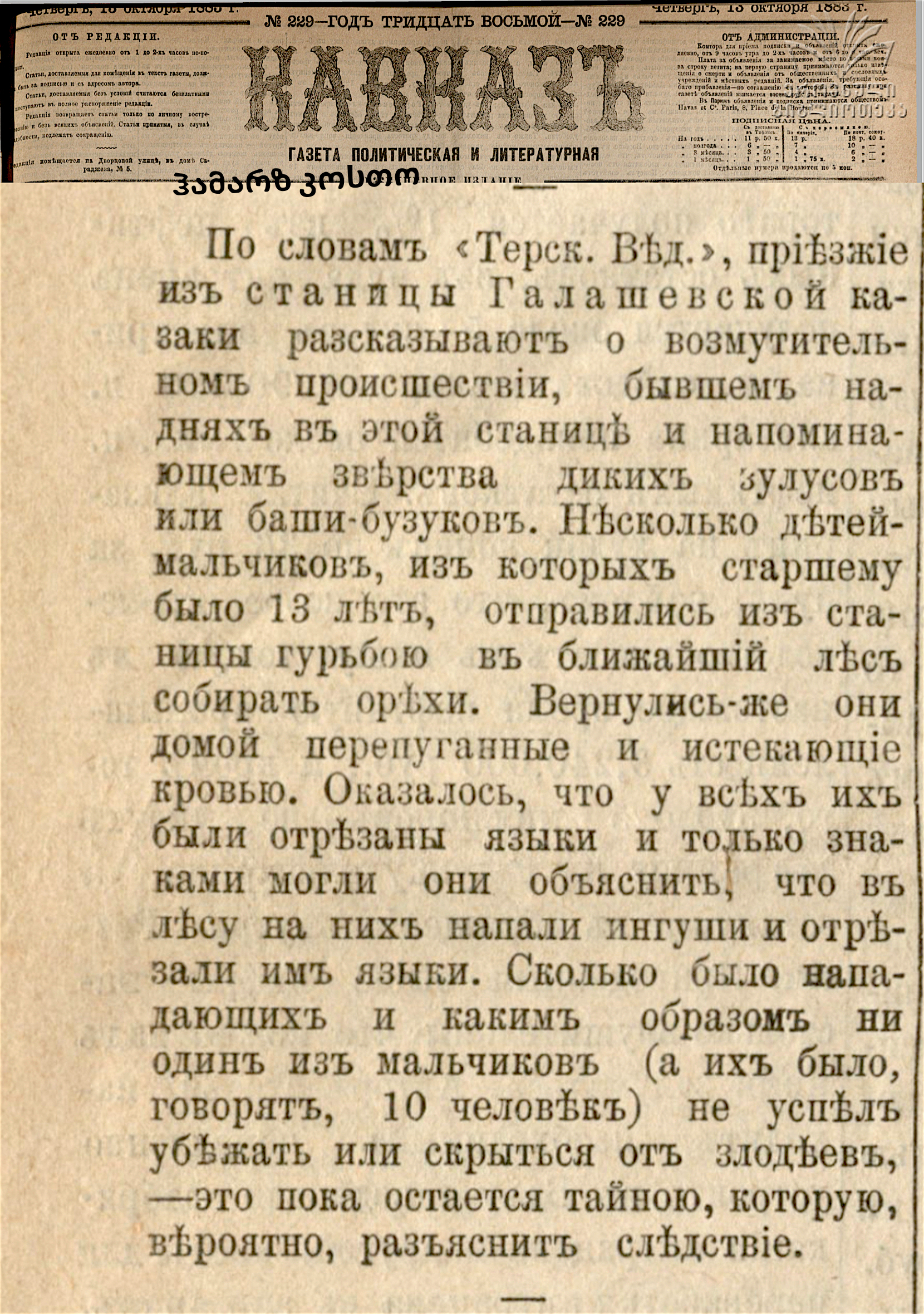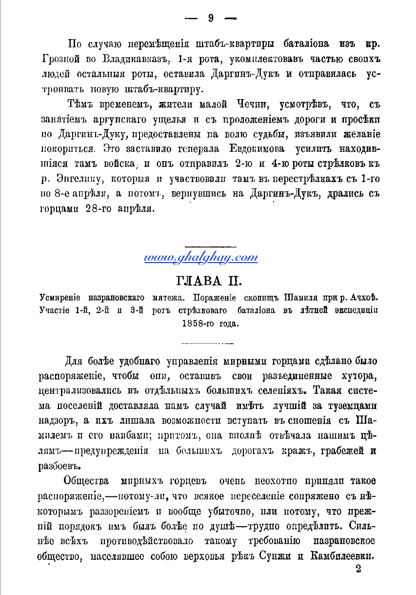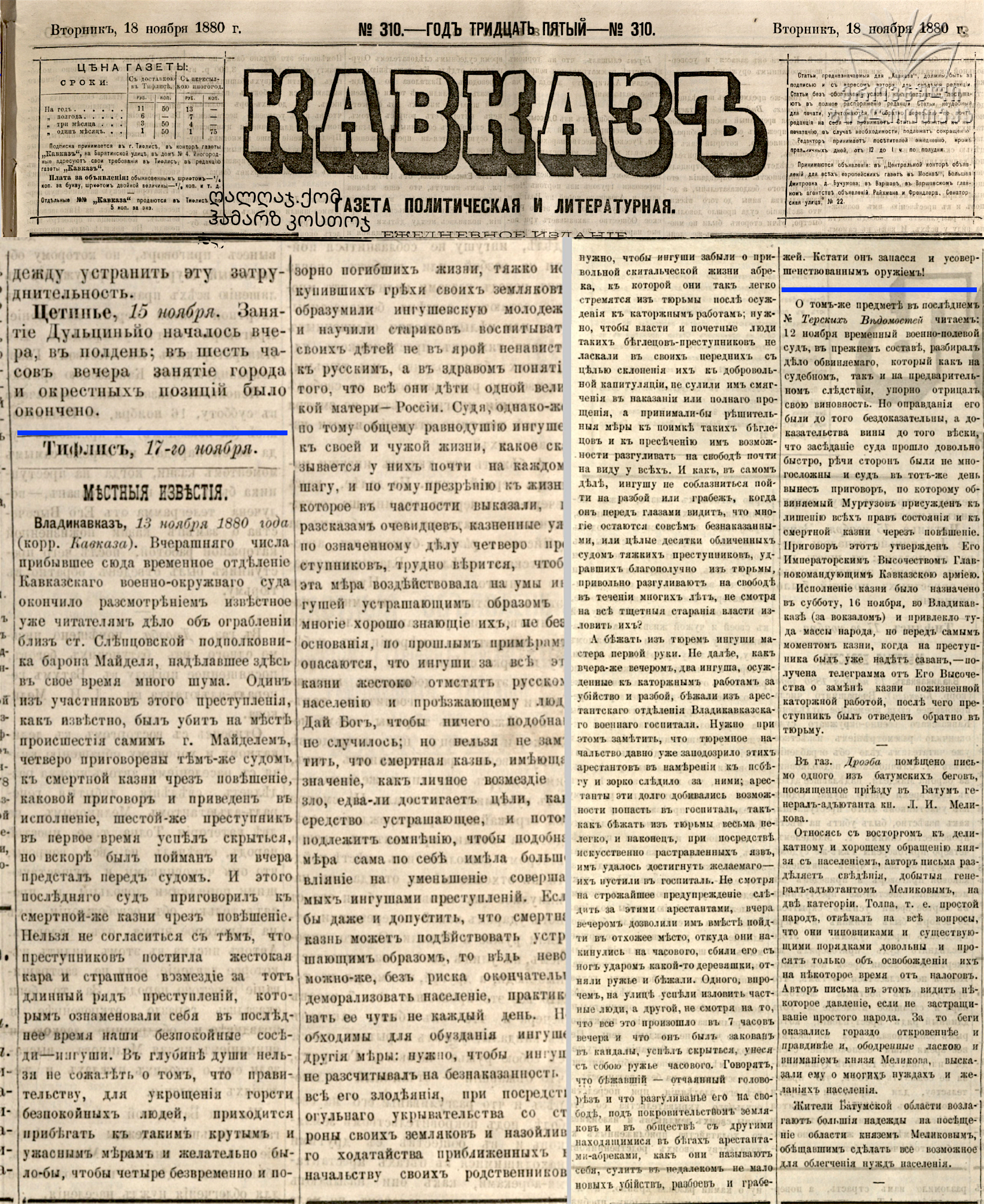 … Скоро мы достигли аула Гули, где тамошние люди нас встретили с большими почестями. Среди них выделялся молодой ингуш с живым умом. Он хорошо говорил по-русски, был грамотен и стремился усовершенствовать свои знания. Он упрашивал нас, чтобы мы непременно прислали ему книг для чтения, что нами и было исполнено по приезде во Владикавказ.