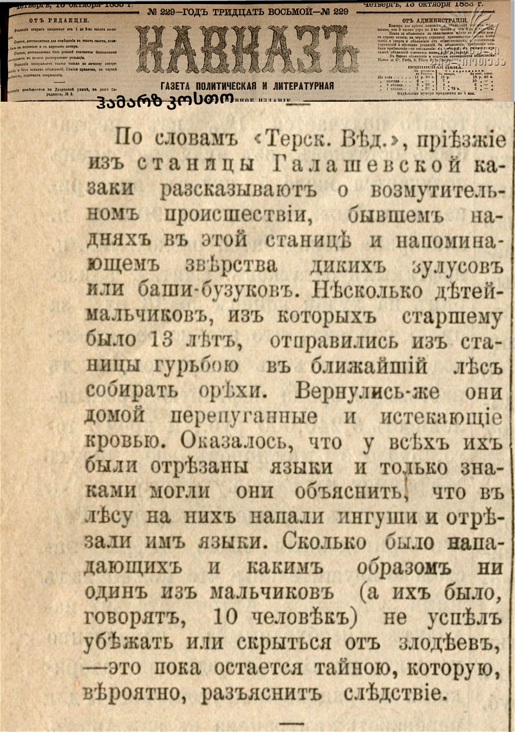 Источник: Газета «Кавказ», от 13/10/1883 года.  Примечание: Согласно Этимологическому словарю русского языка Макса Фасмера, слово «башибозук» в дословном переводе с турецкого означает «с неисправной головой», «безбашенный» (тур. baş «голова» + bozuk «испорченный; бешеный»). Сопоставимо с выражением «сорвиголова». В переносном значении является синонимом слова «головорез».