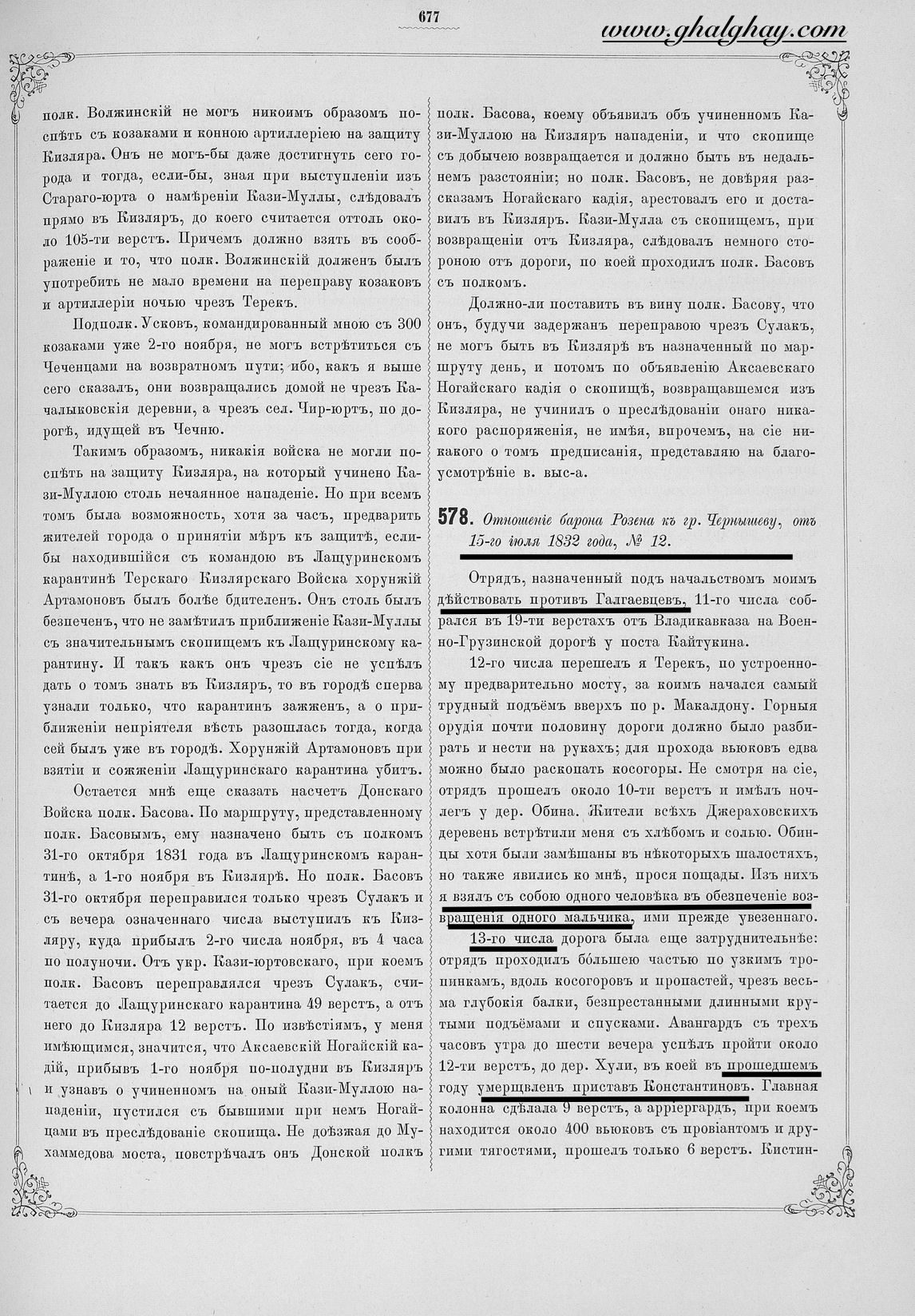 Ингушские старшины известили подполковника Матцена о том, что 13 июня 1785 г. партия сторонников шейх Мансура из пятисот человек с тринадцатью знаменами приблизилась к ГАЛГАЕВСКОМУ СЕЛЕНИЮ ЦОРИ, расположенного высоко в горах в 40 верстах от Владикавказа, с целью его разорения. Но когда эта партия, не дойдя несколько верст до селения, расположились ночевать, то жители Цори, которые были извещены о приближении войск Мансура, ночью внезапно совершили на них нападение и прогнали их. Эта же партия мансуровских войск во всей вероятности попыталась осуществить нападения на деревню Шолхи на Галгаевской равнине и крепость Владикавказ. Генерал-поручик Леонтьев в своем рапорте на имя генерал-поручика П.С. Потемкина от 24 июня 1785 г. сообщил о неудаче нападавшего воинства во главе с Мансуром постигшей их при нападении на ингушские селения и пасущиеся под крепостью Владикавказом ингушские табуны.