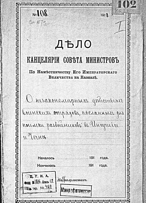 Документ из канцелярии совета министров царской России «О незакономерных действиях воинских отрядов, посланных для поимки разбойников в Ингушии и Чечне».